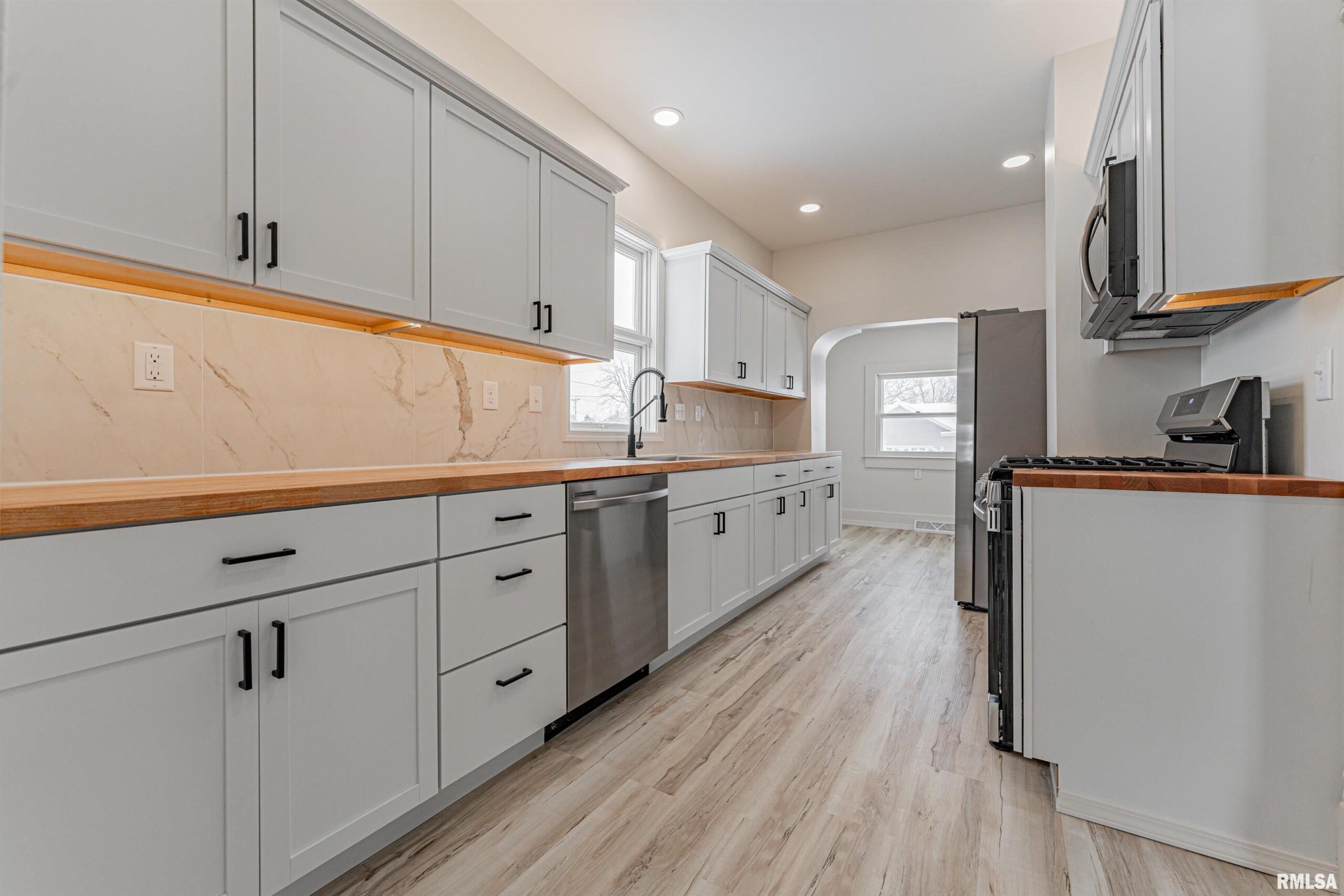 Quite a sleek transformation this choice corner lot 3 bedroom, 2.5 bath aluminum sided two story home has seen over the past six months -- you will absolutely love this one! The main floor offers a gracious front facing living room with great floor space, newly installed luxury vinyl plank flooring, ample natural light, and an open staircase, roomy formal dining room with ample space to accommodate a large table and chairs in addition to an updated adjacent half bath, stunning clean and crisp fully equipped BRAND-NEW kitchen with butcherblock countertops, sleek white cabinetry, stainless appliances, tiled backsplash, large sink, and an adjacent dining nook, comfortably sized bedroom with a neat trey ceiling, and a large laundry/mudroom/enclosed side porch area with access to both a large basement in addition to an exterior rear facing access point. Upstairs, you will find two nice sized bedrooms in addition to a large newly renovated full hall bath. The rear facing primary suite offers a stunning adjacent newly added full private bath with a remarkable tiled walk-in shower complete with a bench and large walk-in closet. Property also features a large usable open concept basement, great covered front porch, above ground swimming pool, 2+ car detached garage with rear alley access, newly installed architectural roof, newer interior doors, modernized fixtures, new central air conditioning unit -- the list goes on! This is not your standard flip -- incredibly well done!