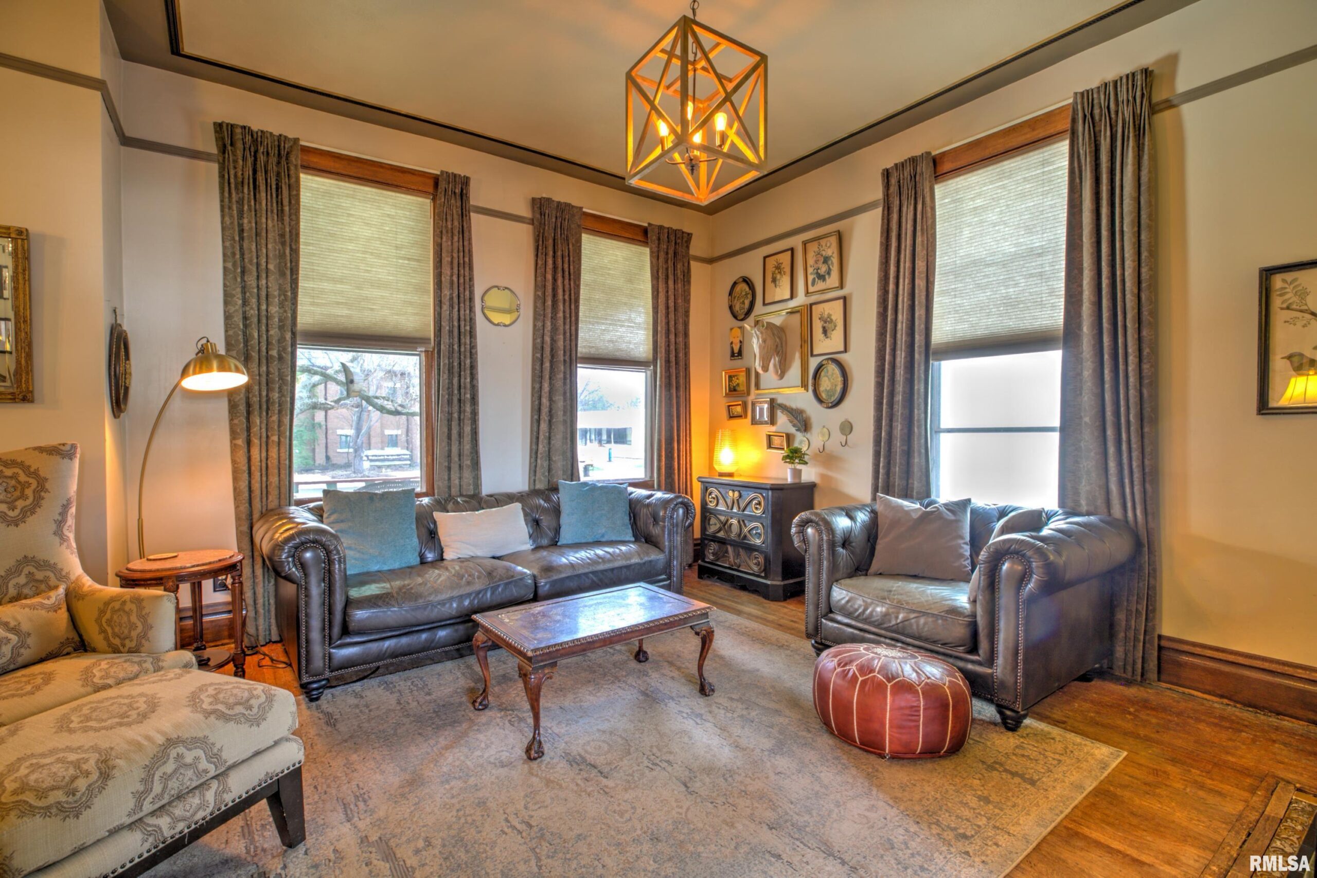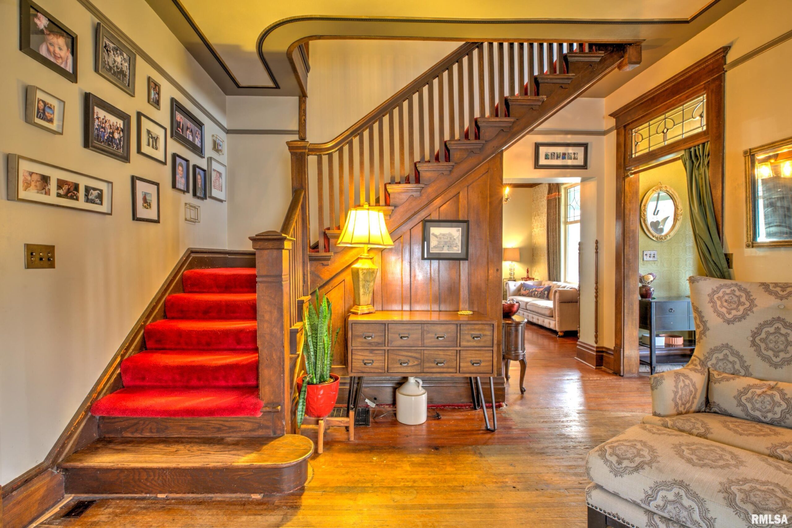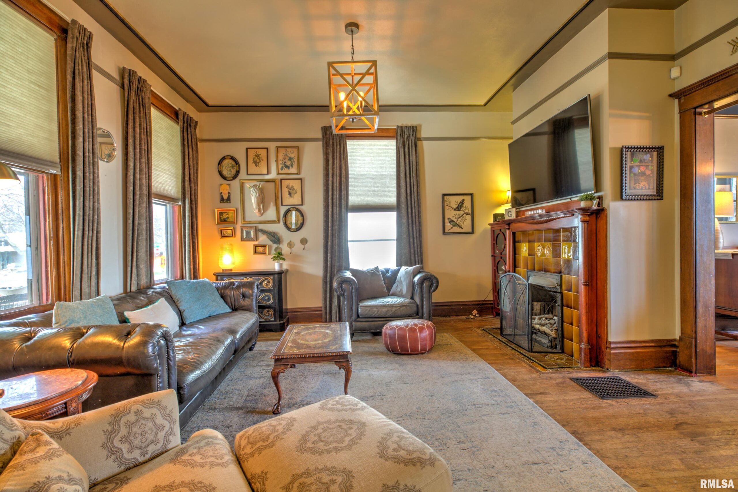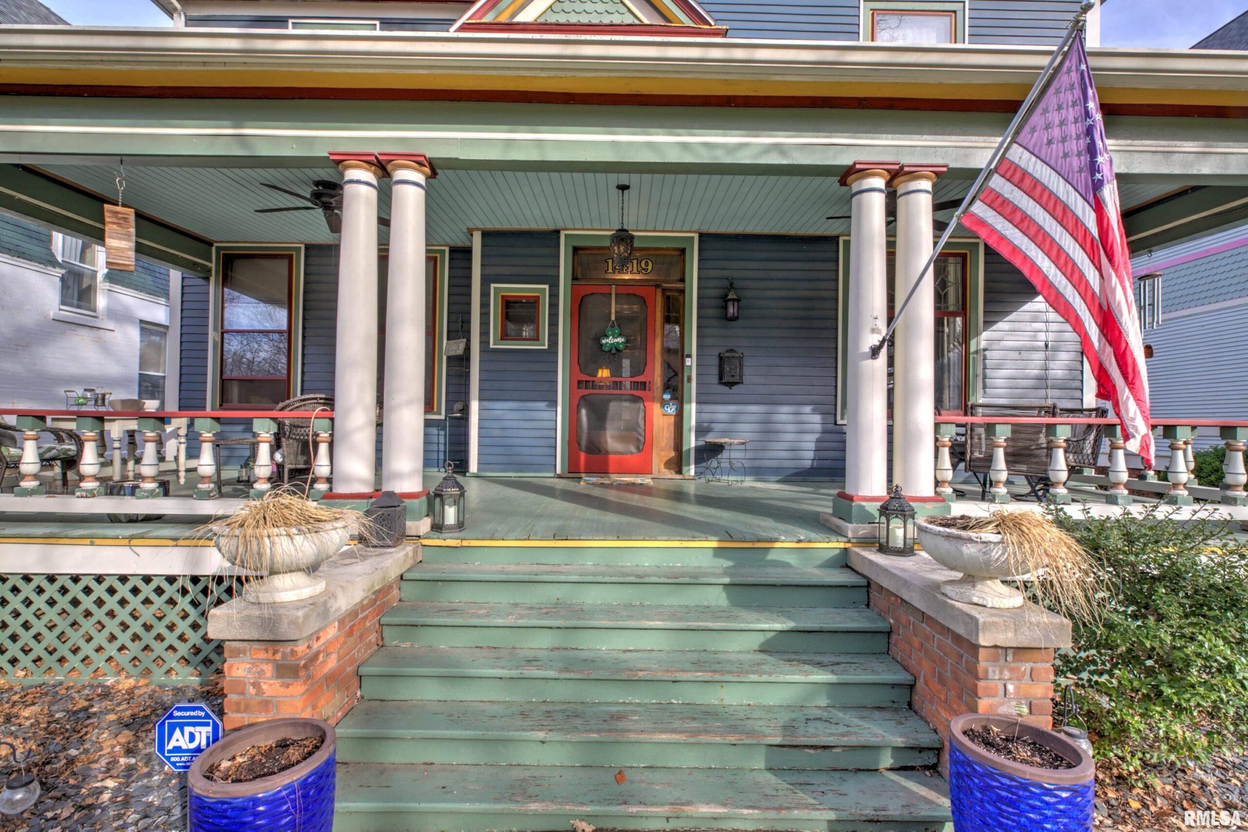 Step into timeless elegance on historic Moss Avenue! This stunning Victorian-style, turn-of-the-century home offers a rare opportunity to own a piece of history on one of the area’s most premier blocks. Rich in preserved character and intricate craftsmanship, this home beautifully blends old-world charm with everyday livability. An inviting oversized front porch sets the tone—perfect for relaxing and enjoying spring and summer evenings. Inside, the cozy living room welcomes you with original hardwood floors, oversized windows, and a gas log fireplace. The formal dining room impresses with a built-in buffet/bar and views of the private backyard, creating the perfect space for entertaining. The fully applianced kitchen offers ample cabinetry, while the show-stopping main floor parlor is truly one of a kind—featuring an ornate chandelier, decorative fireplace, leaded glass windows, and stunning Bradbury & Bradbury handprinted wallpaper. Gorgeous millwork and stained glass throughout highlights the home’s exceptional craftsmanship. Upstairs, you’ll find four bedrooms, each entry accented with striking stained glass and transom details. The fourth bedroom includes access to a walk-up attic, offering incredible potential for future expansion. Enjoy the outdoors in the fully fenced backyard complete with a double patio—ideal for gathering Don't miss your chance to make this amazing Moss Avenue home your own! Fireplace in parlor and primary bedroom are non functioning and ornamental.
