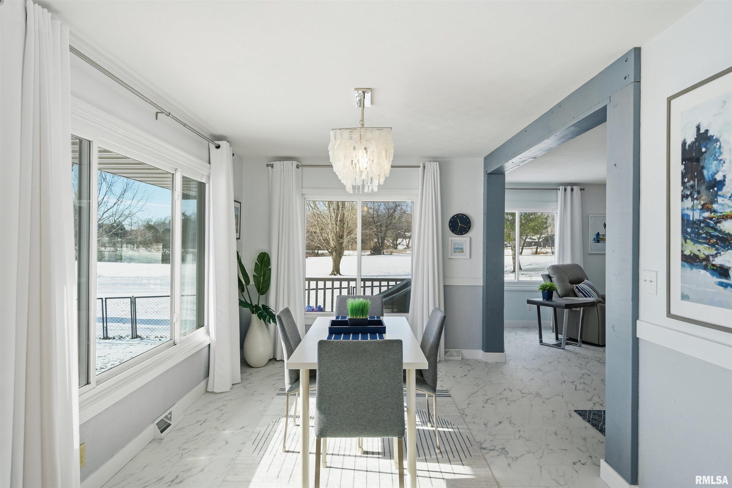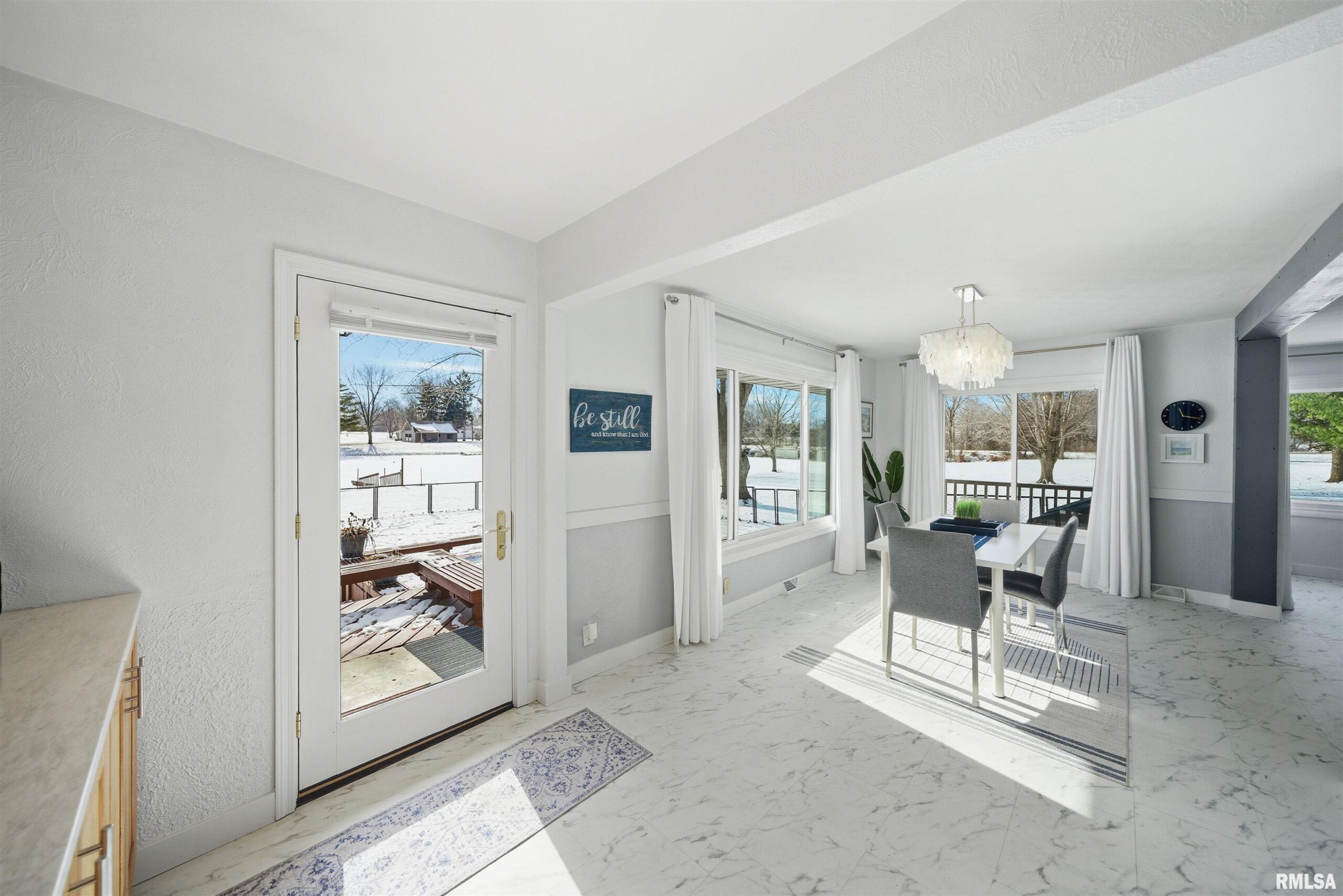 Updated 2025 light bright & airy three bedroom 2 1/2 bath ranch boasting lots of windows to view your 550 foot plus water frontage on 3.66 acres on Long Lake. This ranch home has an attached heated & cooled 24x 24 garage w/200 amp service, keypad, entry, & attic storage. Need more room? Then step over to your 30x36 detached garage w/100 amp panel, keypad entry, & built-in shelving. There is one additional storage building perfect for all your outdoor equipment. The primary suite w/private ensuite boast a huge custom designed walk-in closet. New commercial, gray vinyl tiles & upgraded pad & carpeting throughout 2025. New paint, baseboards, & registers throughtout. Air duct cleaned 2025. Large laundry room w/storage closet plus additional custom shelving, washer, dryer, & pedestals to convey. Kitchen has quartz counters, ceramic backsplash, new dishwasher, SS appliances, & new cabinet hardware. New light fixtures & fans throughout. New 220 line & hot tub on rear deck overlooks the lake for gorgeous sunset enjoyment. 16,000 kW Generac generator w/auto transfer switch -services all buildings 2021. Grand entrance to the property with stone columns w/column lighting frame the black top driveway. Ranch is built on a crawlspace. Crawl walls coated 2022, drain tile & Visqueen 2022, fresh air crawlspace, ventilation 2022, sump pump & back up sum. The list goes on! Don’t forget your new floating dock w/a three boat capacity. Trolling motors only on Long Lake.
