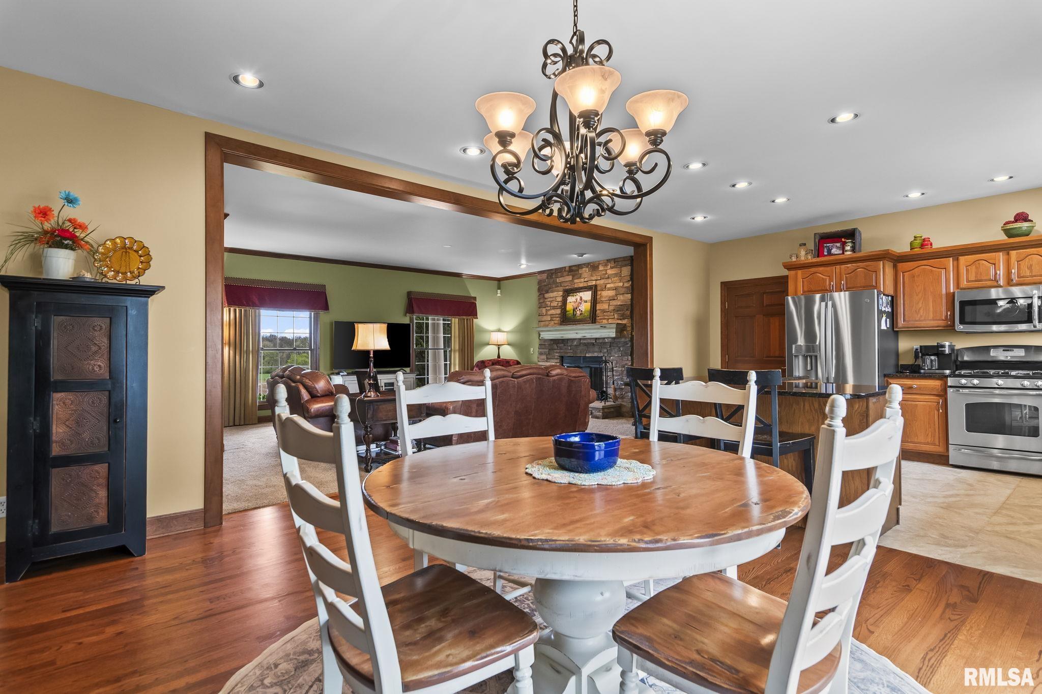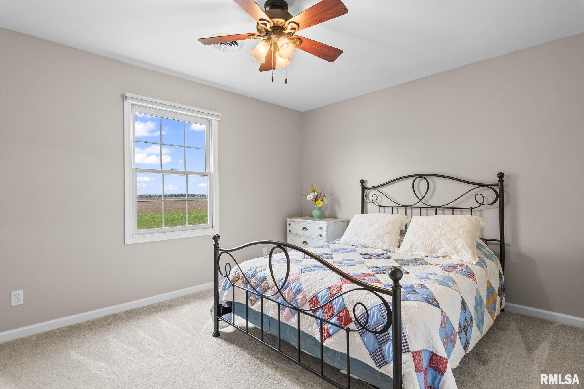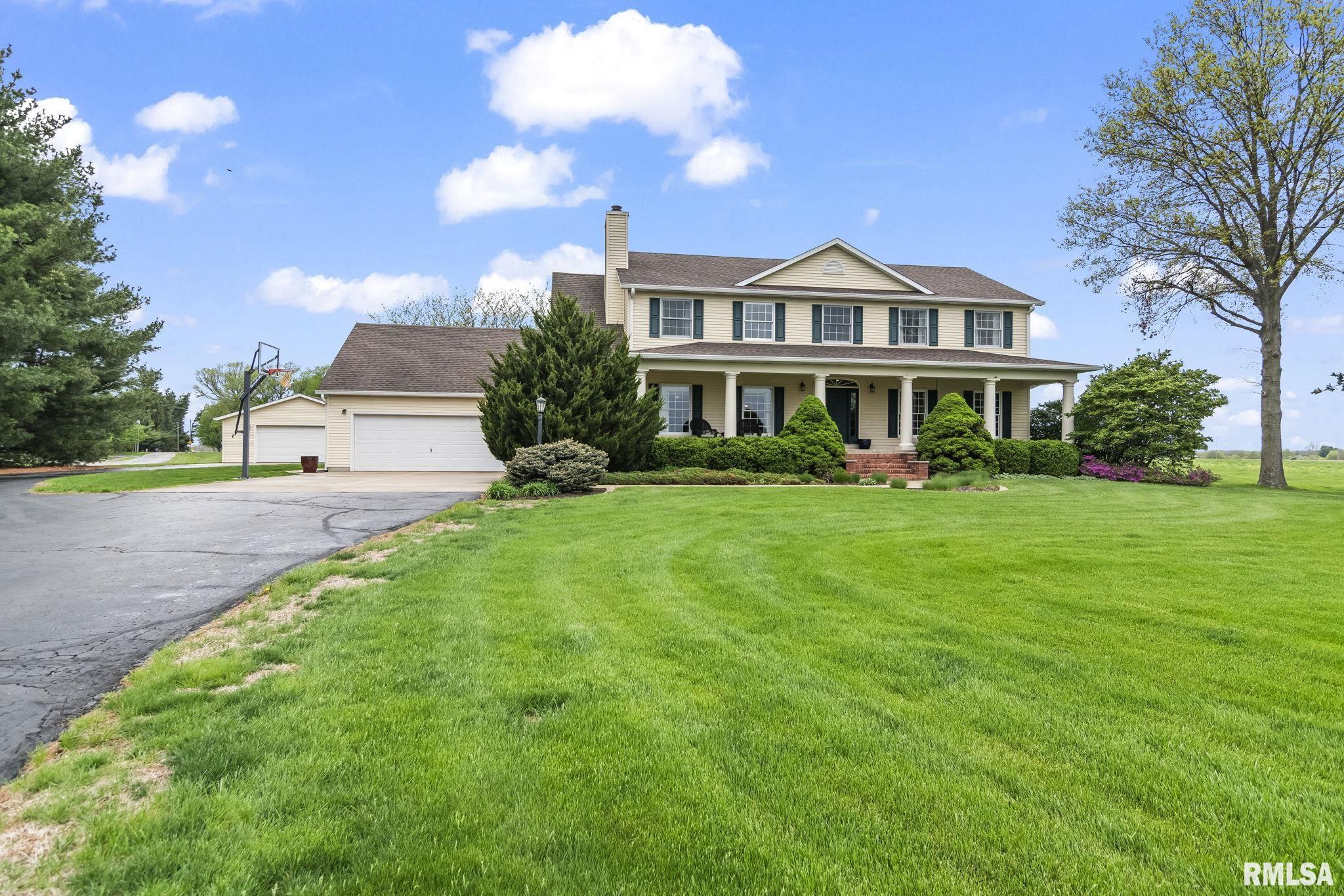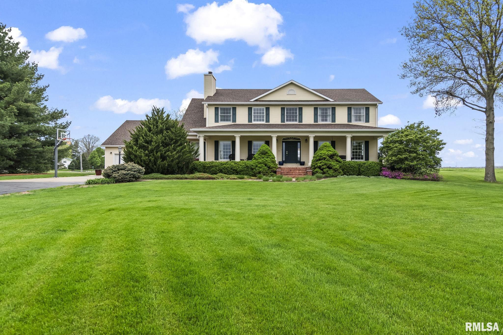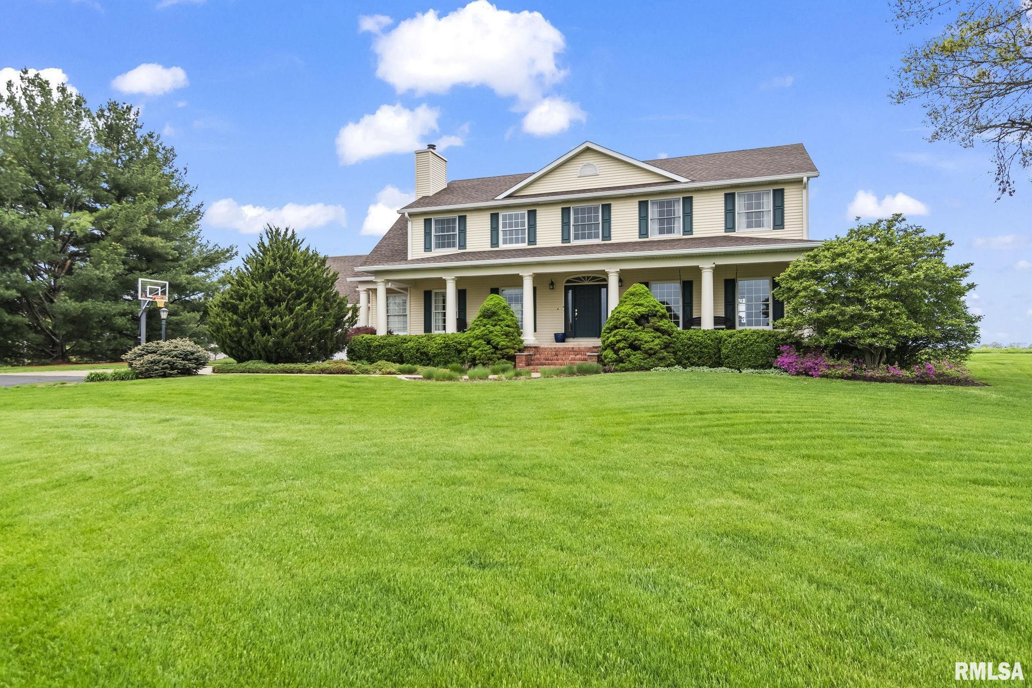 Rare find! This stunning plantation-style home sits atop a hill with breathtaking sunrises and sunsets in a peaceful, private setting. Enjoy the inviting front porch before entering a spacious main level featuring a formal living room (perfect for an office), formal dining room, and a cozy family room with gas assist wood burning fireplace open to the kitchen. Also on the main level: half bath, laundry, walk-in pantry, and a beautiful sunroom ideal for relaxing and taking in the views. Upstairs offers 5 bedrooms, including a large primary suite with fresh paint and new carpet, plus the convenience of a second washer and dryer. The finished lower level adds incredible flexibility with a 6th bedroom, full bath, kitchenette, theater area, and rec space. Situated on 5 acres with 4 acres tillable ground, this property includes a 2 car attached garage, 4 car detached garage, and a long asphalt driveway. Located in the desirable New Berlin School District, just minutes from Springfield’s west side and the Sangamon Valley Trail. Extensive updates include new roof and gutters(2025) HVAC (2021), garage door openers (2023), appliances (2023), granite in baths, updated flooring, fresh paint, refinished hardwoods, cedar deck (2020), and a 30’ above-ground pool (2020). City water, security system, and invisible fence included, perfect for those seeking peaceful country living with room for animals, just minutes from city amenities.