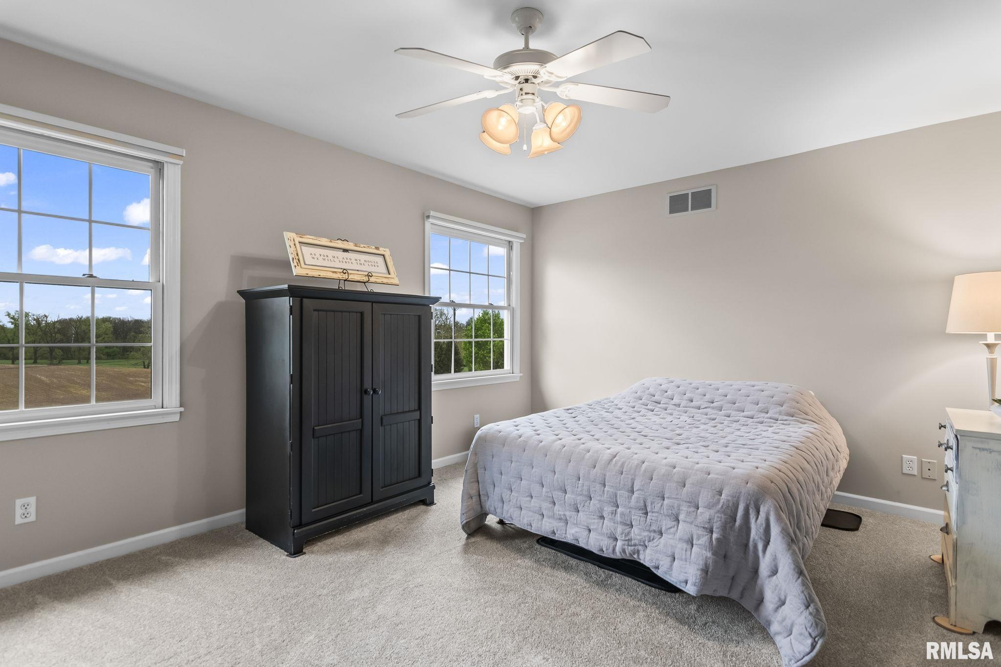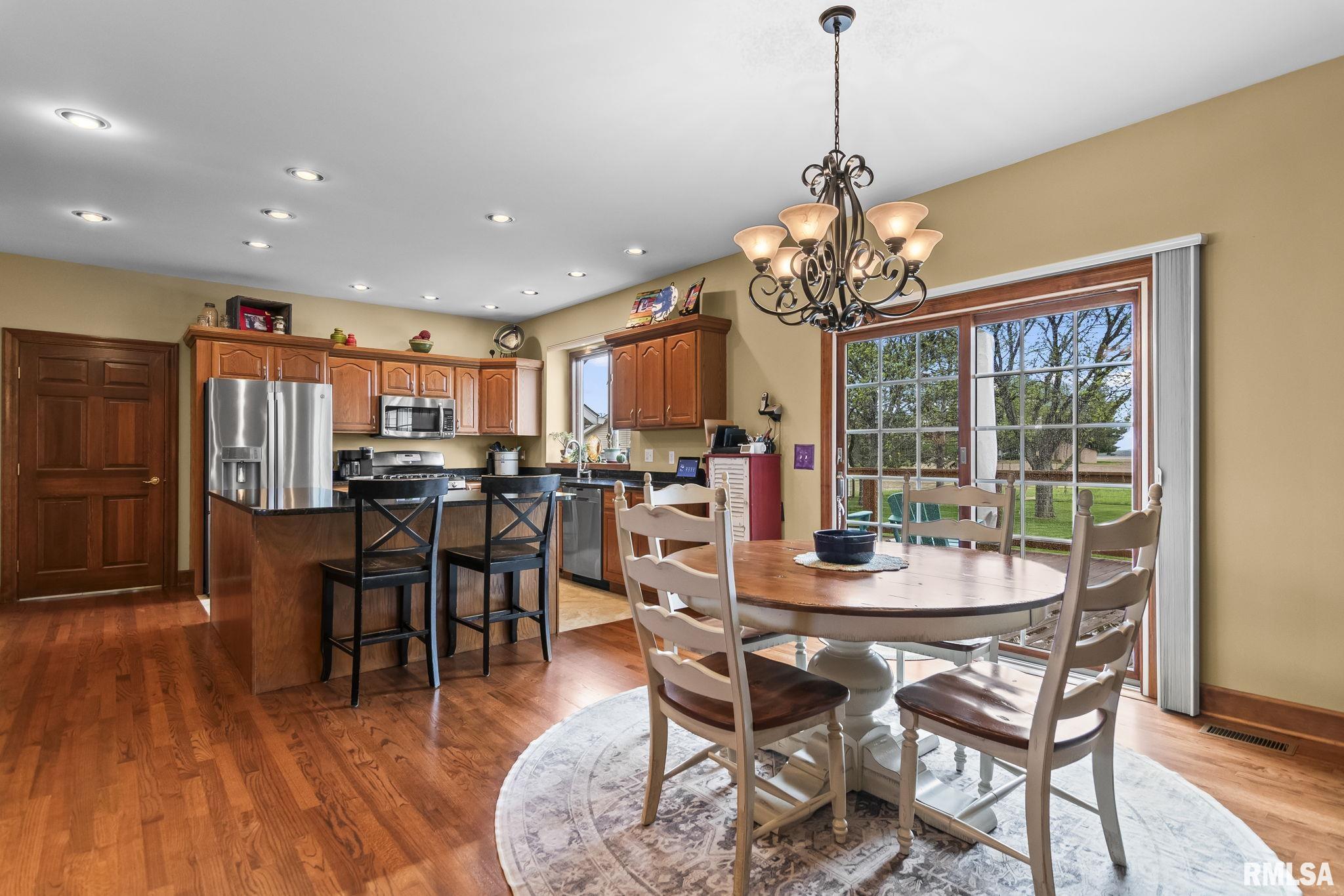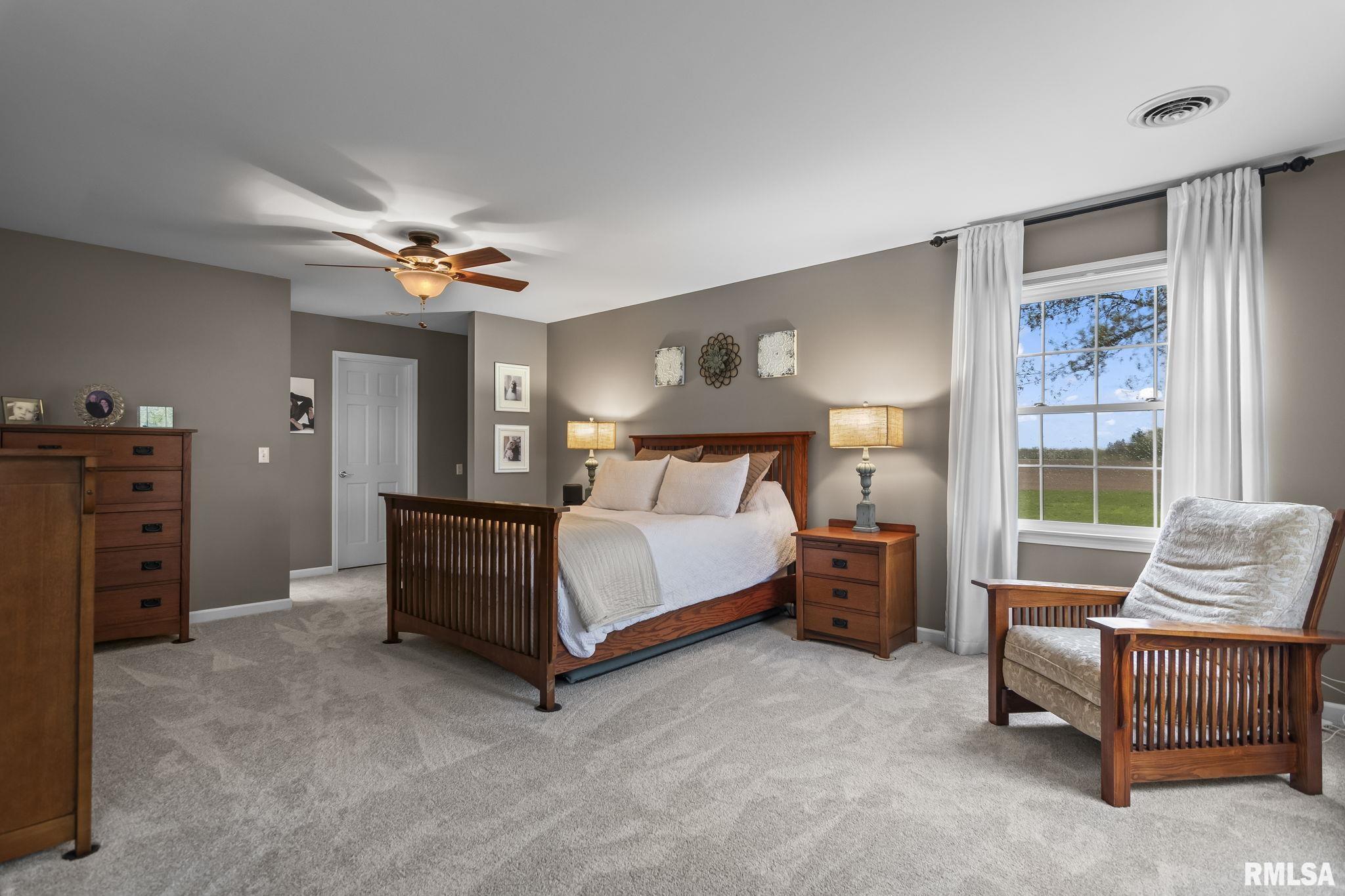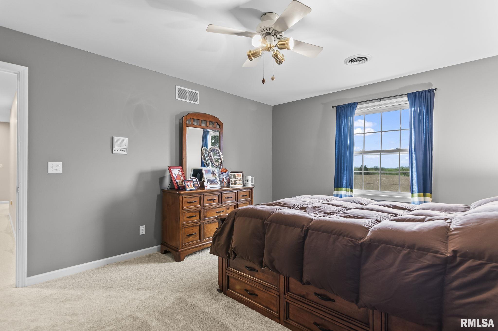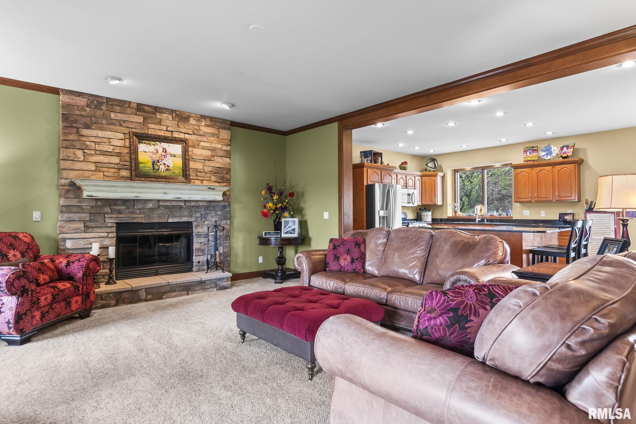 Rare find! This stunning plantation-style home sits atop a hill with breathtaking sunrises and sunsets in a peaceful, private setting. Enjoy the inviting front porch before entering a spacious main level featuring a formal living room (perfect for an office), formal dining room, and a cozy family room with gas assist wood burning fireplace open to the kitchen. Also on the main level: half bath, laundry, walk-in pantry, and a beautiful sunroom ideal for relaxing and taking in the views. Upstairs offers 5 bedrooms, including a large primary suite with fresh paint and new carpet, plus the convenience of a second washer and dryer. The finished lower level adds incredible flexibility with a 6th bedroom, full bath, kitchenette, theater area, and rec space. Situated on 5 acres with 4 acres tillable ground, this property includes a 2 car attached garage, 4 car detached garage, and a long asphalt driveway. Located in the desirable New Berlin School District, just minutes from Springfield’s west side and the Sangamon Valley Trail. Extensive updates include new roof and gutters(2025) HVAC (2021), garage door openers (2023), appliances (2023), granite in baths, updated flooring, fresh paint, refinished hardwoods, cedar deck (2020), and a 30’ above-ground pool (2020). City water, security system, and invisible fence included, perfect for those seeking peaceful country living with room for animals, just minutes from city amenities.