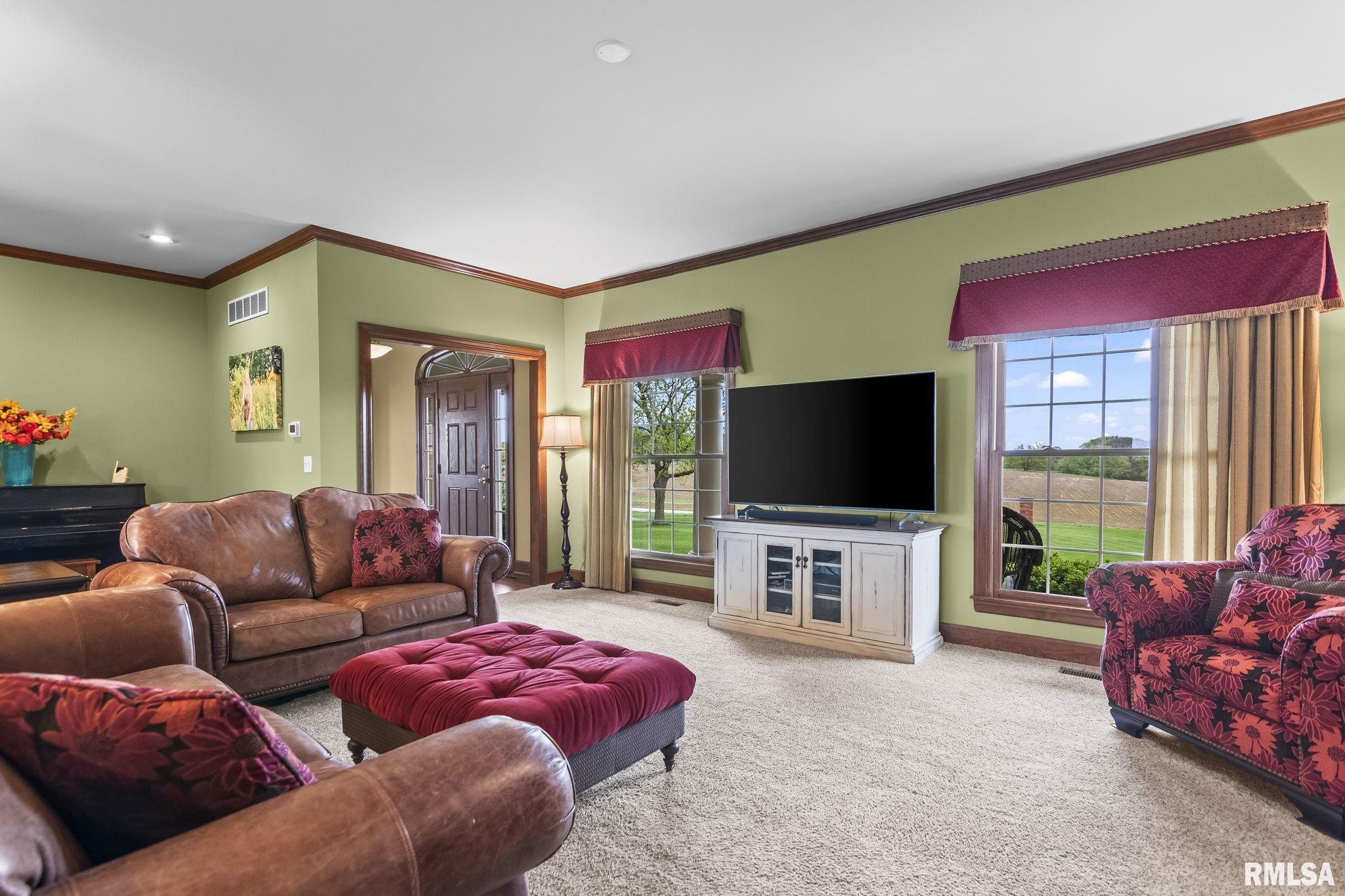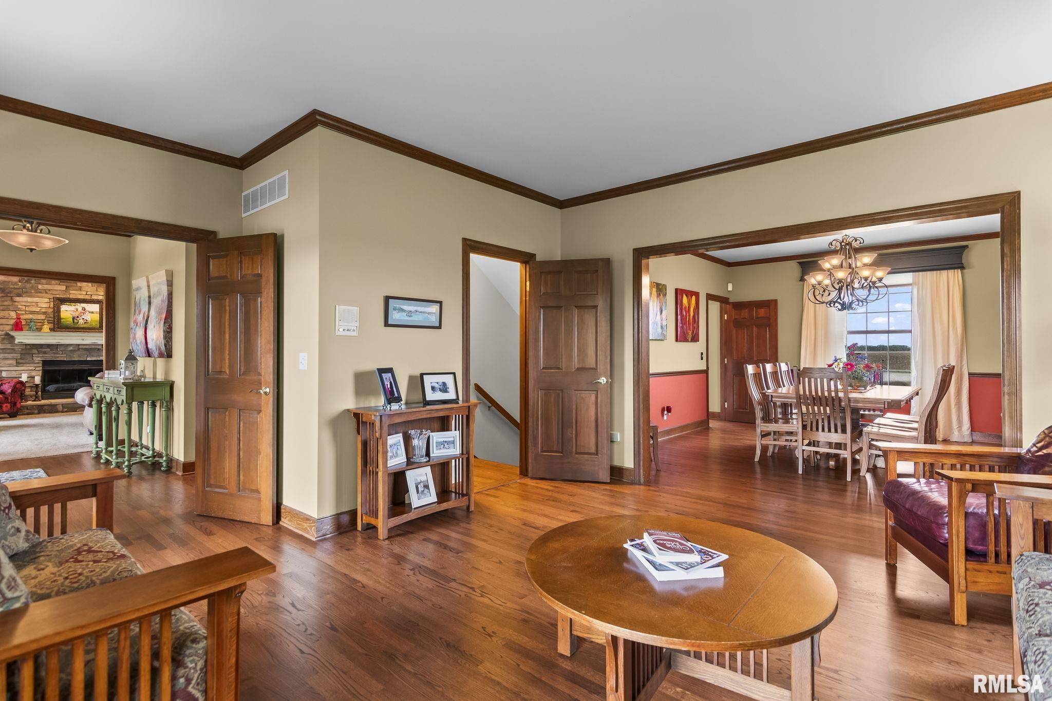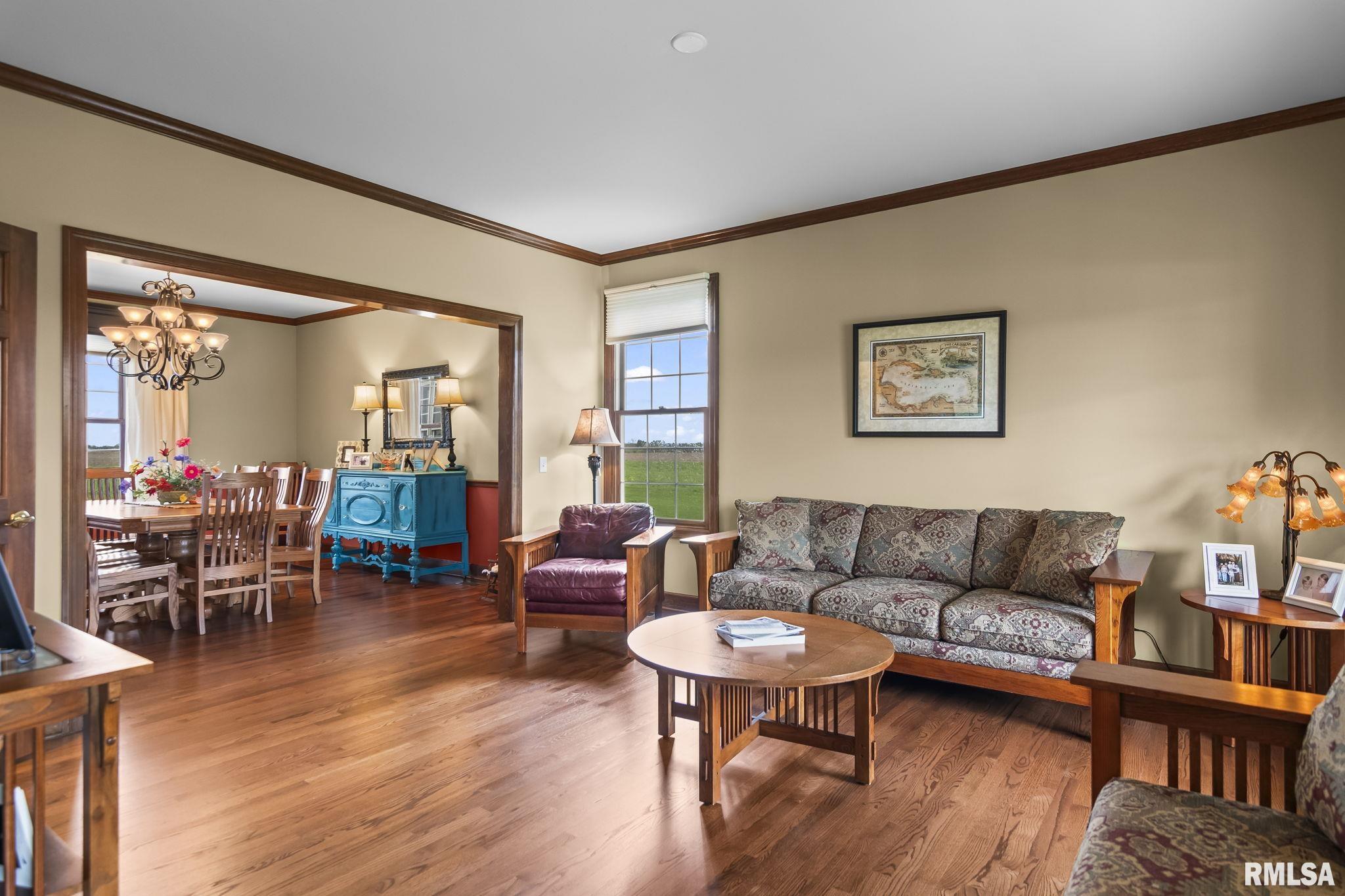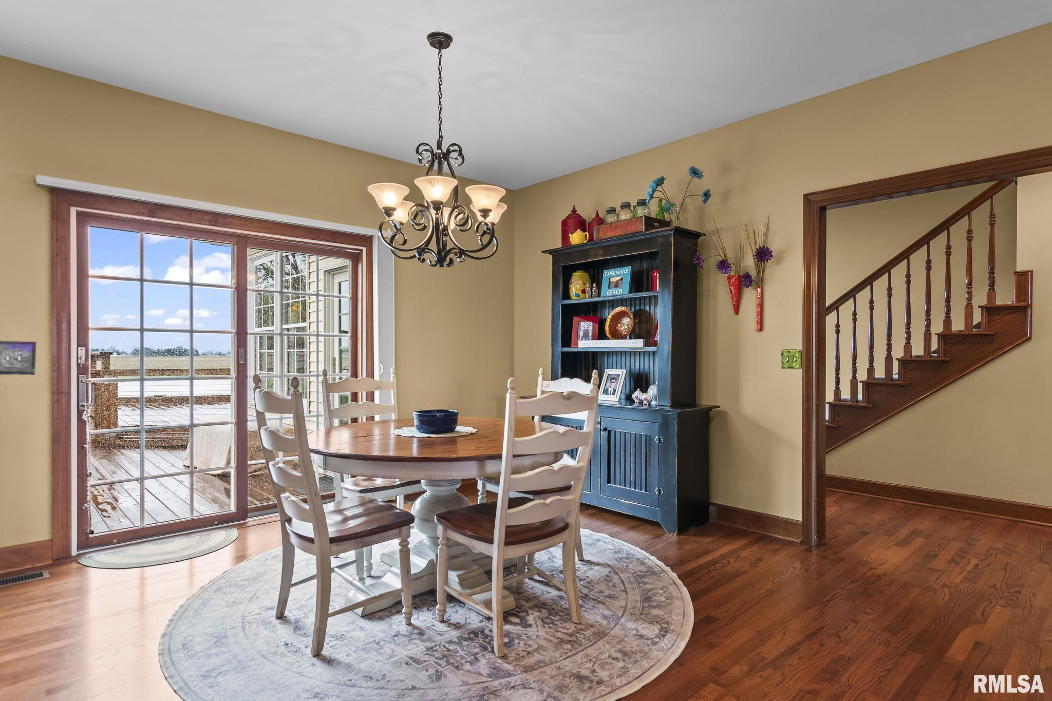 Rare find! This stunning plantation-style home sits atop a hill with breathtaking sunrises and sunsets in a peaceful, private setting. Enjoy the inviting front porch before entering a spacious main level featuring a formal living room (perfect for an office), formal dining room, and a cozy family room with gas assist wood burning fireplace open to the kitchen. Also on the main level: half bath, laundry, walk-in pantry, and a beautiful sunroom ideal for relaxing and taking in the views. Upstairs offers 5 bedrooms, including a large primary suite with fresh paint and new carpet, plus the convenience of a second washer and dryer. The finished lower level adds incredible flexibility with a 6th bedroom, full bath, kitchenette, theater area, and rec space. Situated on 5 acres with 4 acres tillable ground, this property includes a 2 car attached garage, 4 car detached garage, and a long asphalt driveway. Located in the desirable New Berlin School District, just minutes from Springfield’s west side and the Sangamon Valley Trail. Extensive updates include new roof and gutters(2025) HVAC (2021), garage door openers (2023), appliances (2023), granite in baths, updated flooring, fresh paint, refinished hardwoods, cedar deck (2020), and a 30’ above-ground pool (2020). City water, security system, and invisible fence included, perfect for those seeking peaceful country living with room for animals, just minutes from city amenities.