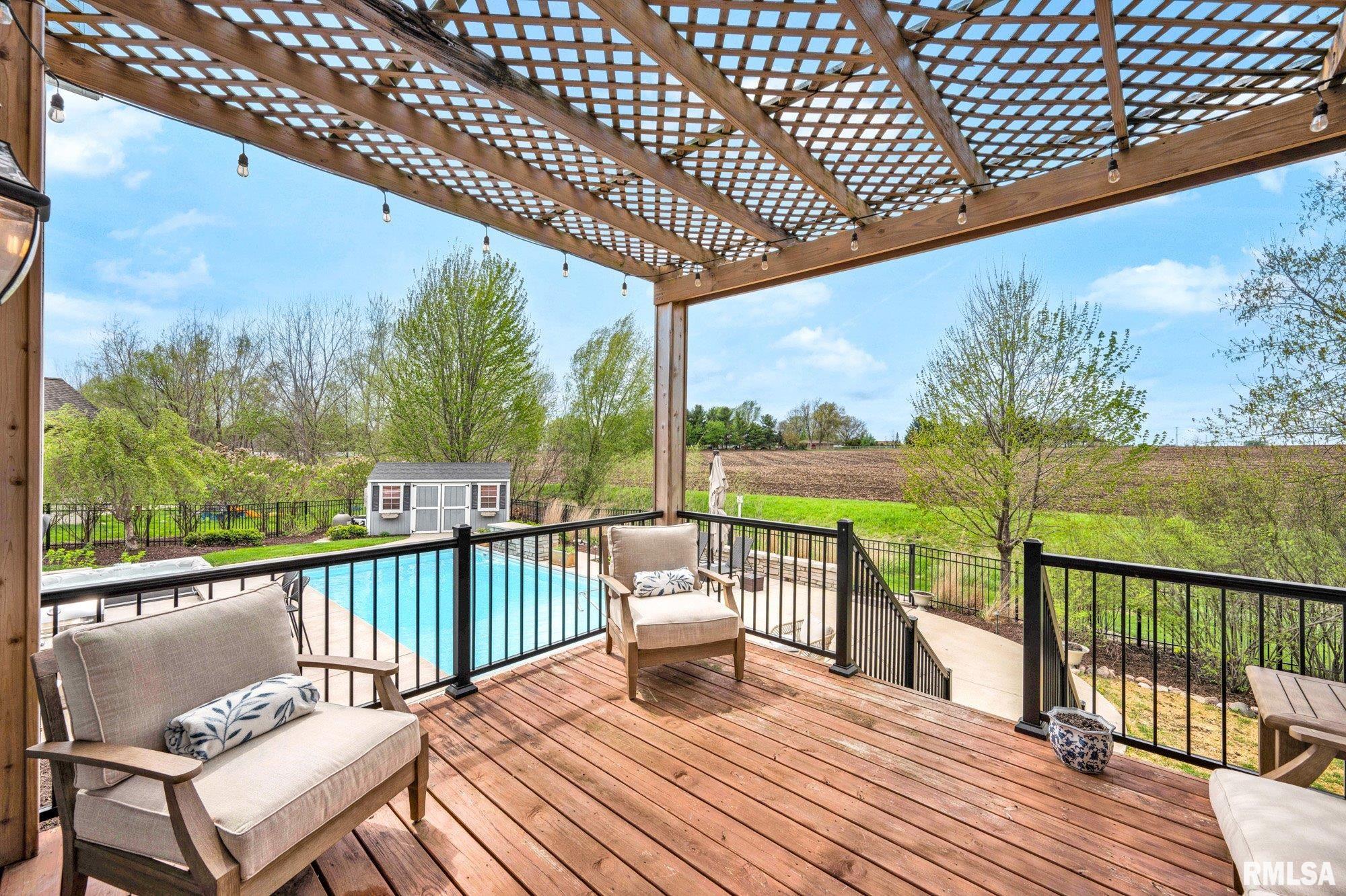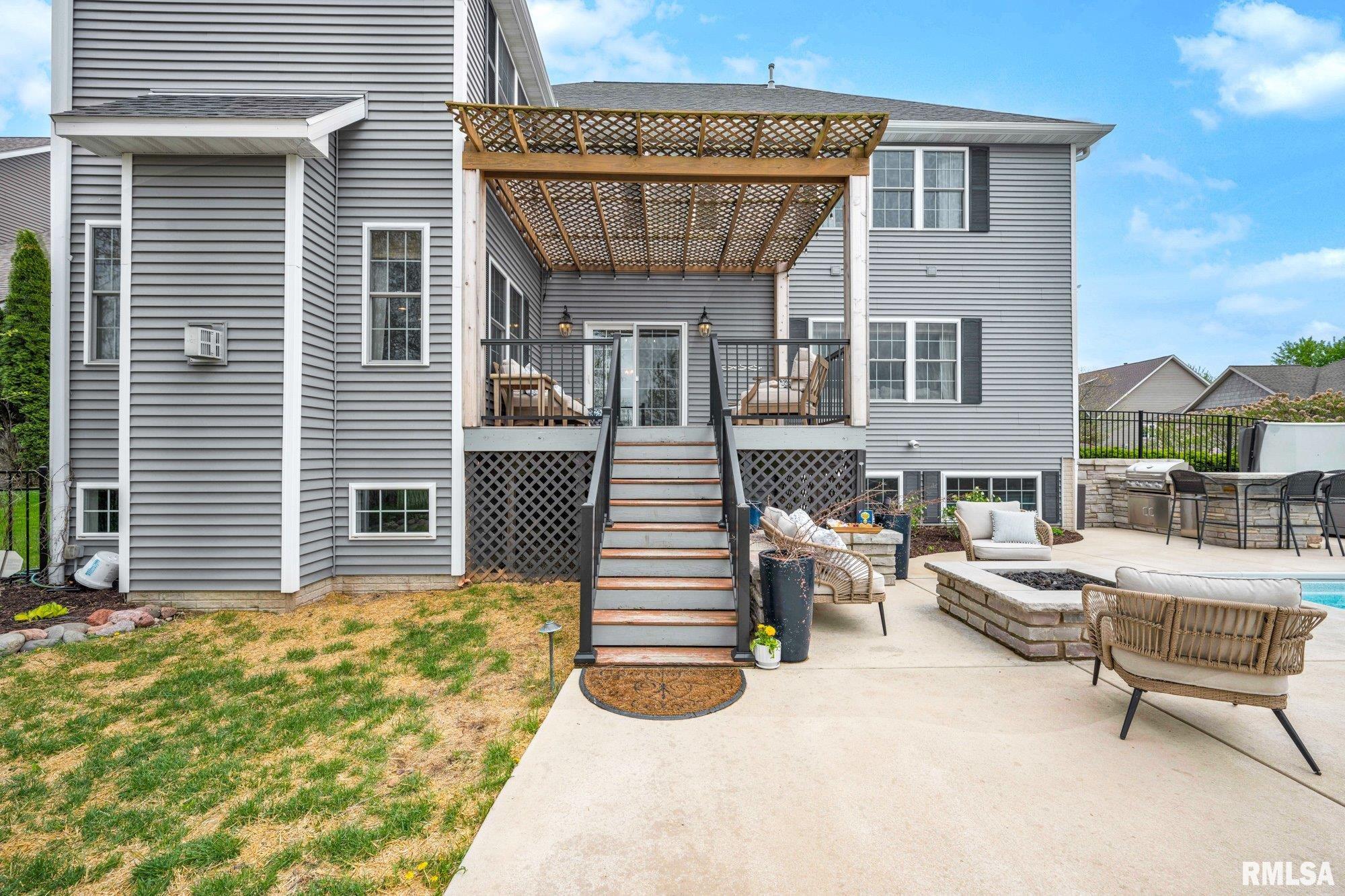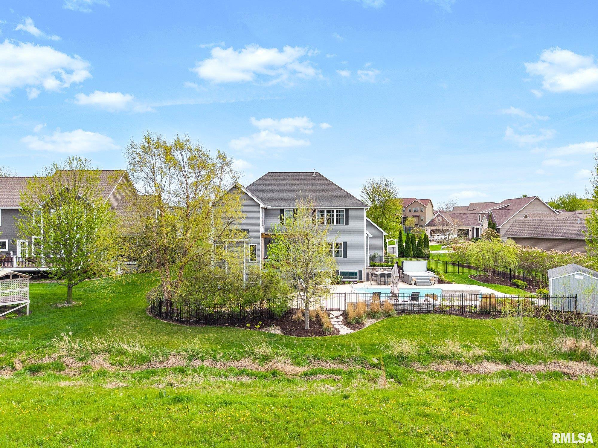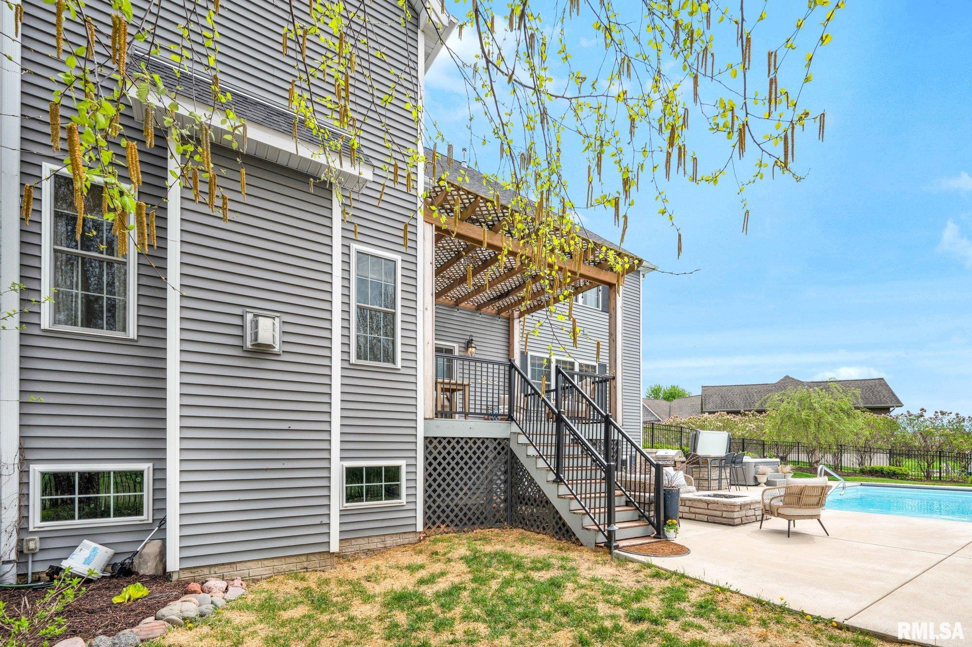Thoughtfully designed and beautifully appointed, this 4 bedroom, 3.5 bath home is tucked on a cul-de-sac, backing to open field for added privacy. A welcoming wraparound porch with swing and professional landscaping create a polished first impression, while a black wrought iron fenced backyard with multiple gates enhances function and style. The backyard retreat is designed for entertaining, featuring a deck off the informal dining area overlooking a patio, saltwater pool with waterfall features, saltwater hot tub (approx. 3 years old), firepit, and built-in grilling station with mini refrigerator. Inside, a two-story foyer with Asian walnut hardwood flooring flows through much of the main level. The pillared living room with gas fireplace opens to the informal dining area and kitchen with custom black cabinetry, GE Café appliances, double oven, two dishwashers, quartz countertops, and handcrafted Moroccan tile backsplash. A walk-in pantry adds exceptional storage, while a fireplaced dining/bonus room offers flexibility. Upstairs, the primary suite features a tray ceiling, decorative tin tile accents, dual vanities, jetted tub, and separate shower. Three additional bedrooms with walk-in closets, full bath, and laundry complete the upper level. Basement includes a family room, recreation area, gym with egress (potential 5th bedroom), and ample storage.