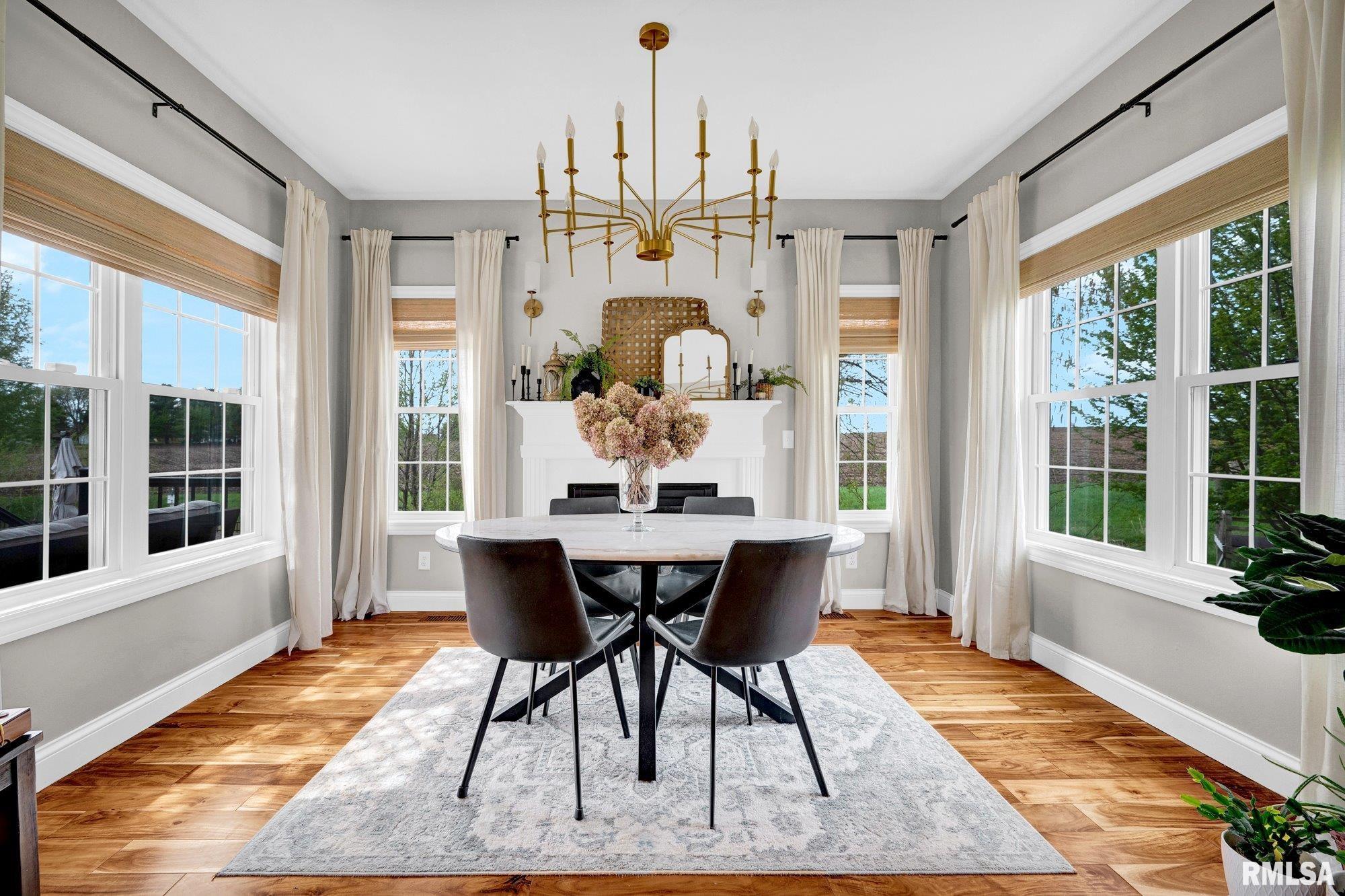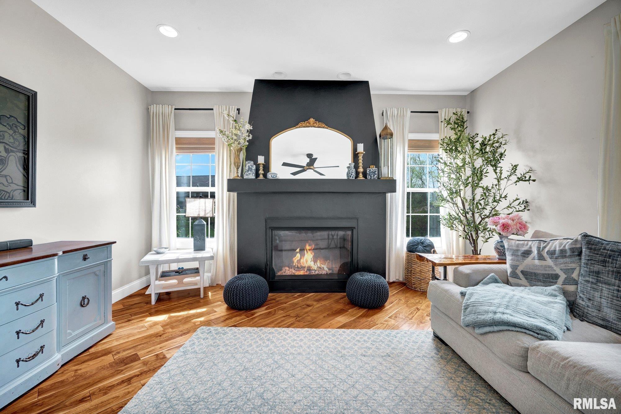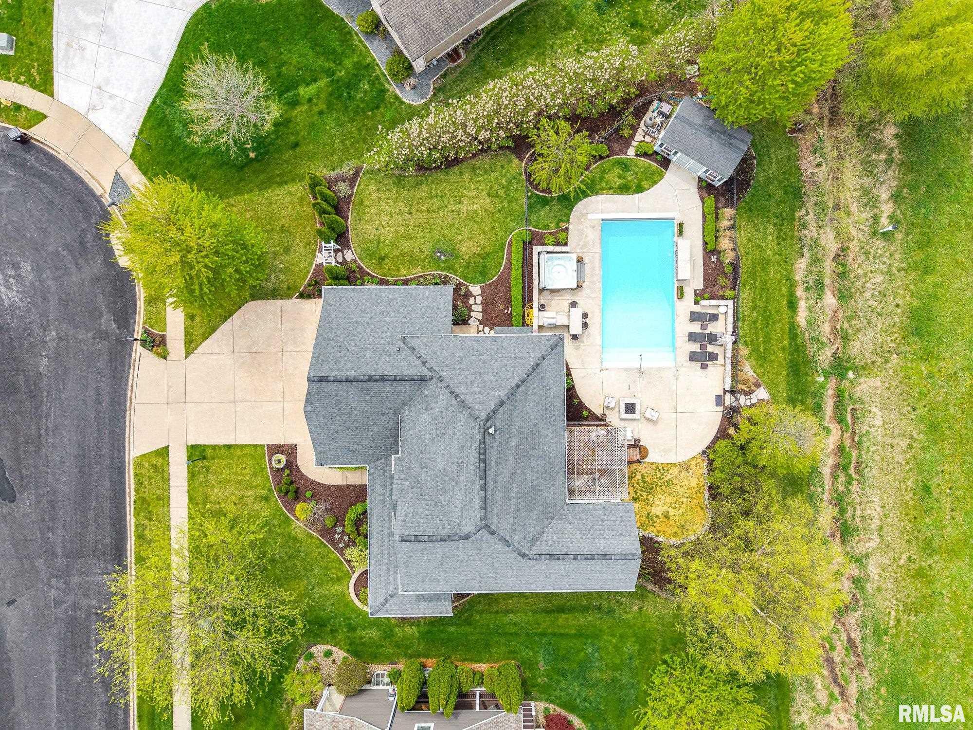 Thoughtfully designed and beautifully appointed, this 4 bedroom, 3.5 bath home is tucked on a cul-de-sac, backing to open field for added privacy. A welcoming wraparound porch with swing and professional landscaping create a polished first impression, while a black wrought iron fenced backyard with multiple gates enhances function and style. The backyard retreat is designed for entertaining, featuring a deck off the informal dining area overlooking a patio, saltwater pool with waterfall features, saltwater hot tub (approx. 3 years old), firepit, and built-in grilling station with mini refrigerator. Inside, a two-story foyer with Asian walnut hardwood flooring flows through much of the main level. The pillared living room with gas fireplace opens to the informal dining area and kitchen with custom black cabinetry, GE Café appliances, double oven, two dishwashers, quartz countertops, and handcrafted Moroccan tile backsplash. A walk-in pantry adds exceptional storage, while a fireplaced dining/bonus room offers flexibility. Upstairs, the primary suite features a tray ceiling, decorative tin tile accents, dual vanities, jetted tub, and separate shower. Three additional bedrooms with walk-in closets, full bath, and laundry complete the upper level. Basement includes a family room, recreation area, gym with egress (potential 5th bedroom), and ample storage.