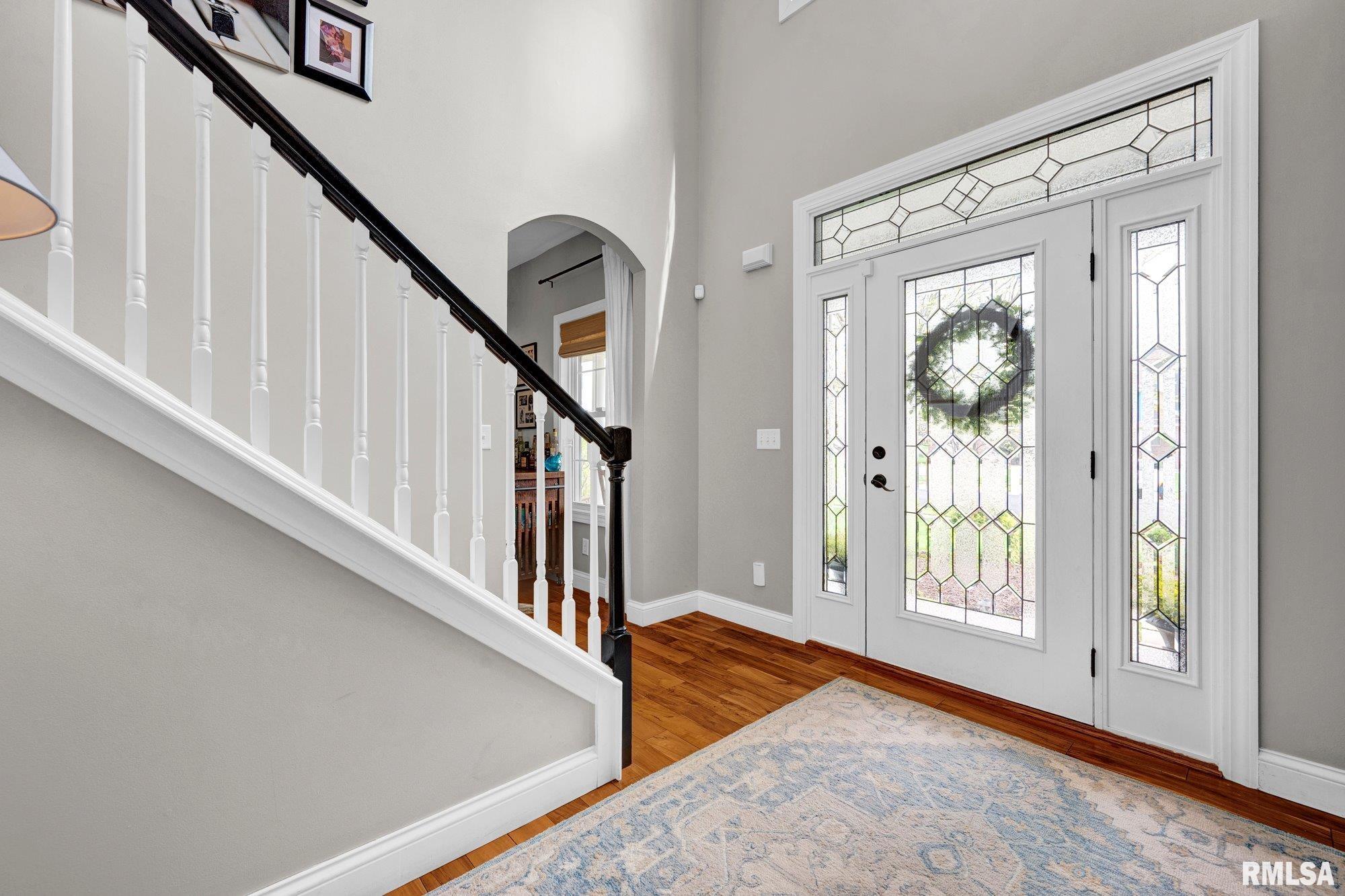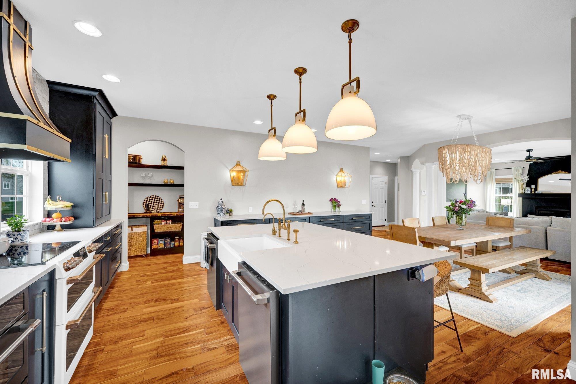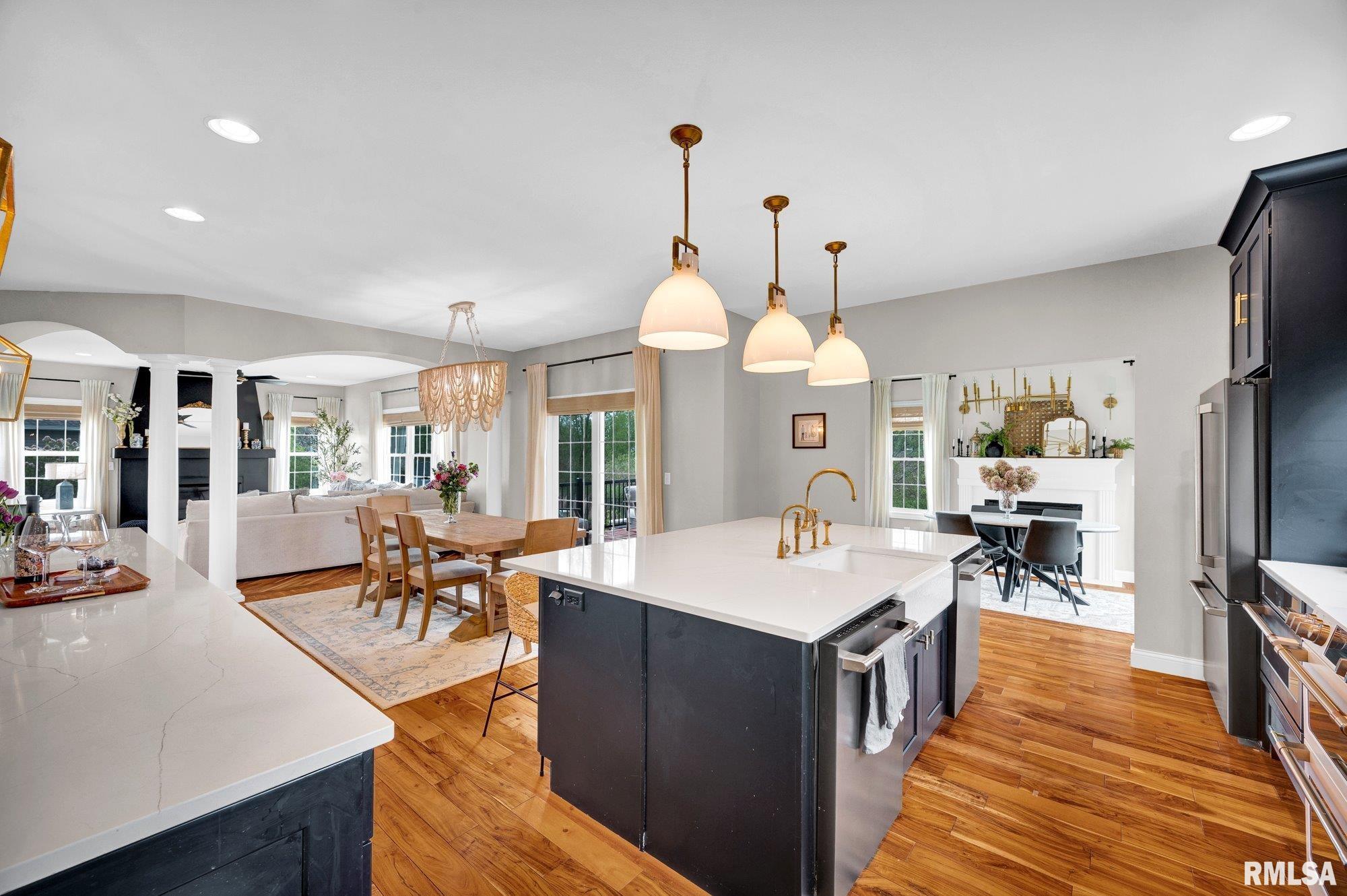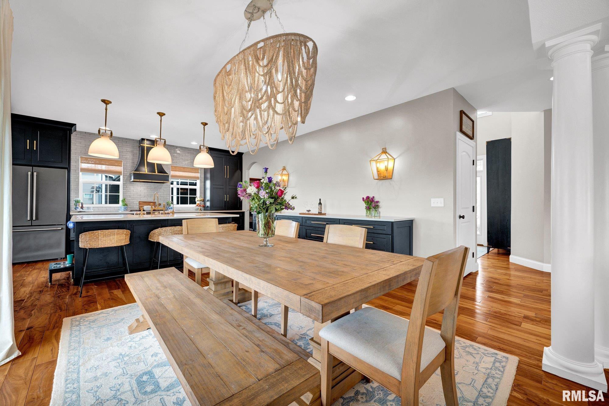 Thoughtfully designed and beautifully appointed, this 4 bedroom, 3.5 bath home is tucked on a cul-de-sac, backing to open field for added privacy. A welcoming wraparound porch with swing and professional landscaping create a polished first impression, while a black wrought iron fenced backyard with multiple gates enhances function and style. The backyard retreat is designed for entertaining, featuring a deck off the informal dining area overlooking a patio, saltwater pool with waterfall features, saltwater hot tub (approx. 3 years old), firepit, and built-in grilling station with mini refrigerator. Inside, a two-story foyer with Asian walnut hardwood flooring flows through much of the main level. The pillared living room with gas fireplace opens to the informal dining area and kitchen with custom black cabinetry, GE Café appliances, double oven, two dishwashers, quartz countertops, and handcrafted Moroccan tile backsplash. A walk-in pantry adds exceptional storage, while a fireplaced dining/bonus room offers flexibility. Upstairs, the primary suite features a tray ceiling, decorative tin tile accents, dual vanities, jetted tub, and separate shower. Three additional bedrooms with walk-in closets, full bath, and laundry complete the upper level. Basement includes a family room, recreation area, gym with egress (potential 5th bedroom), and ample storage.