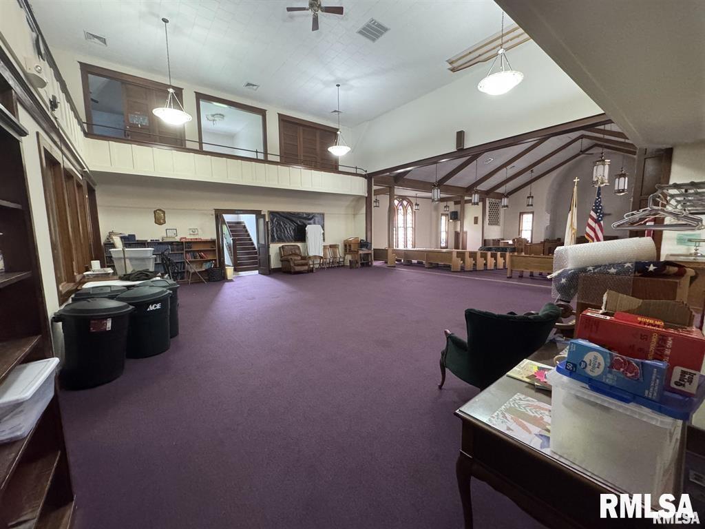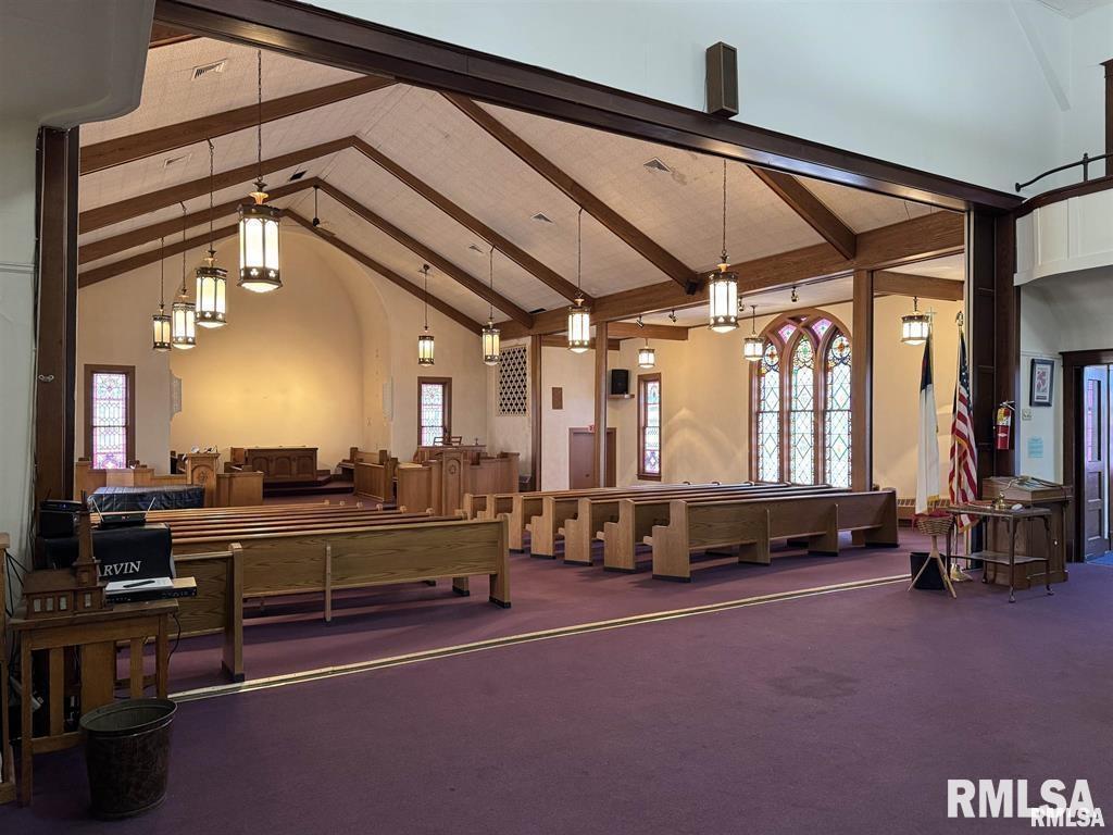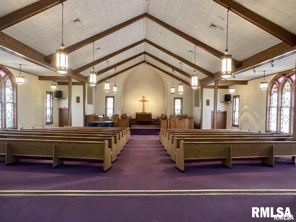This beautiful building was once the home of the Presbyterian Church in Bushnell, IL. Located in the center of town, with nearly 7000 square feet of living space, you have endless opportunities for its use. There is a small main floor kitchen as well as a large cafeteria space in the basement. Restrooms can be found on the main level as well as in the basement. There's potential for 7 bedrooms in this space- 5 on the upper level and 2 on the main floor. This all-brick building, originally built in 1869, is handicap accessible and on roughly 1/2 an acre of land. Building is being sold as-is. So many possibilities!