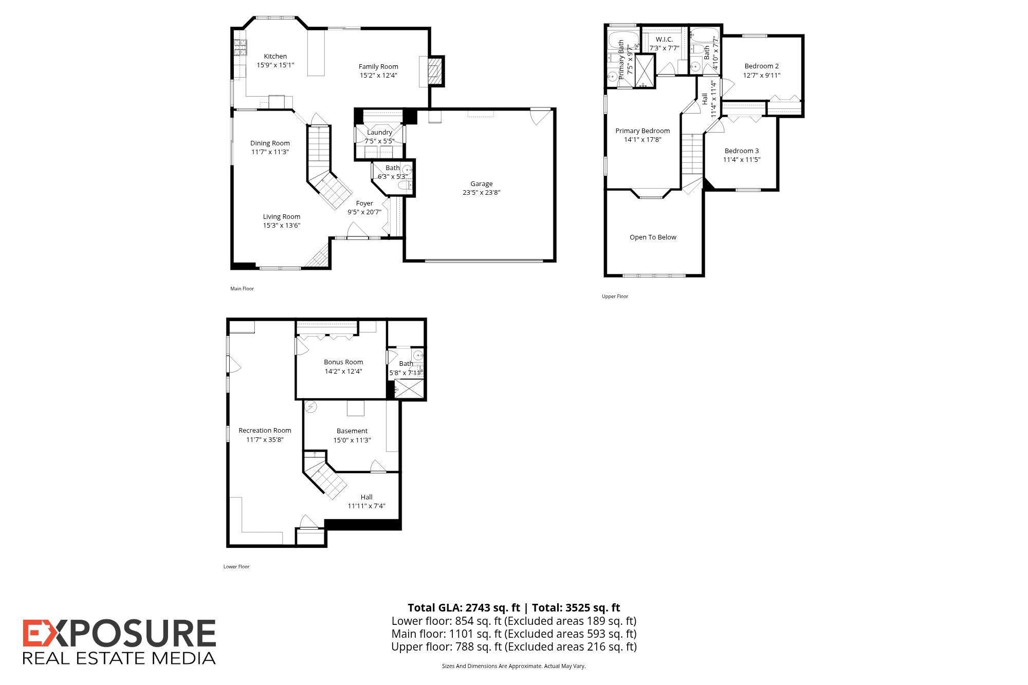 Room type Area Level Length Width Main Level 1428 Upper Level 714 Lower Level Basement 1200 Additional Level Bedroom 1 Upper 15 17 Bedroom 2 Upper 12 14 Bedroom 3 Upper 14 13 Living Room Main 16 15 Family Room Main 18 14 Dining Room Main 12 15 Kitchen Main 14 15 Recreation Room Basement 22 15 Laundry Main 4 8 Additional Room Basement 15 18 Additional Room 2 Third Floor