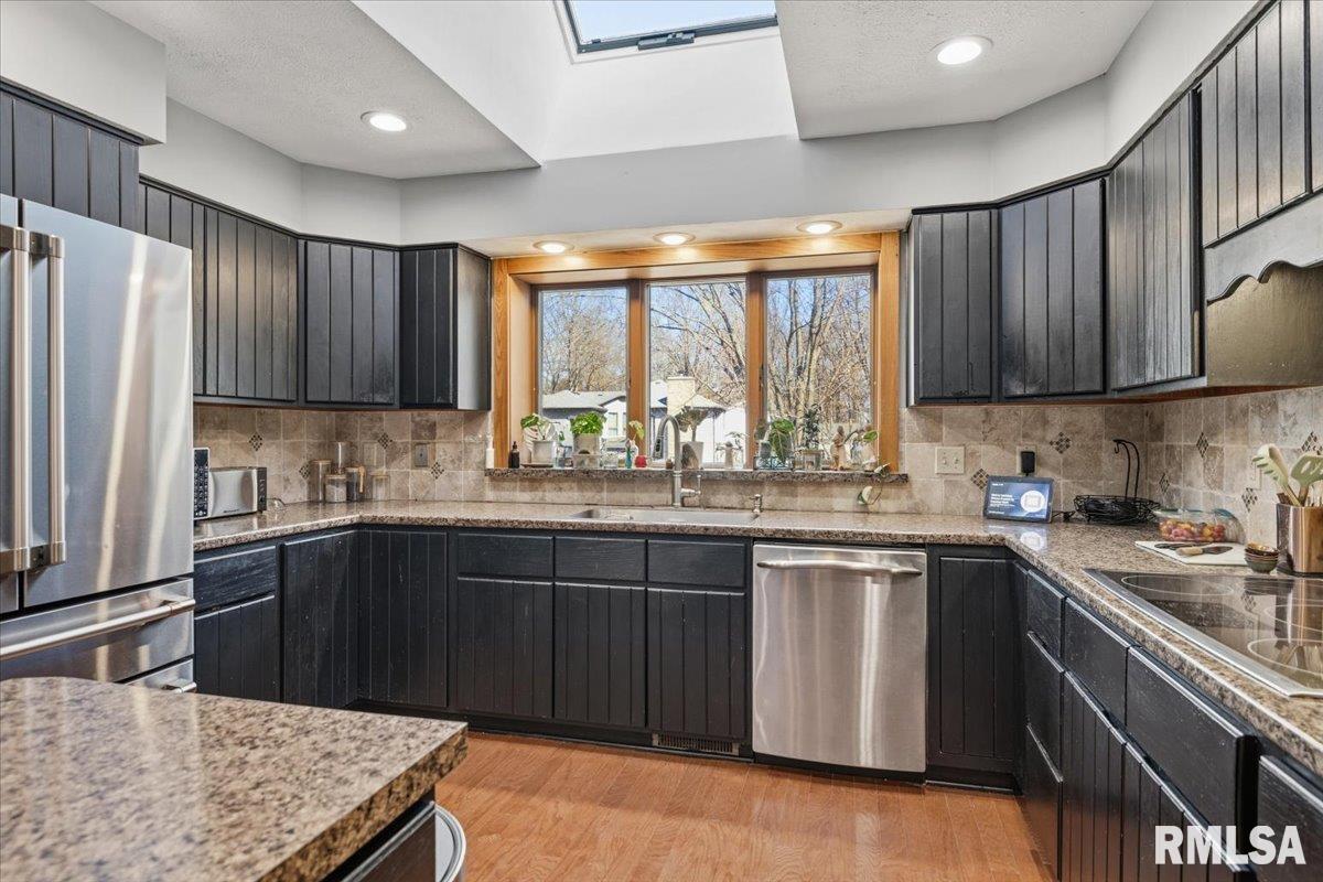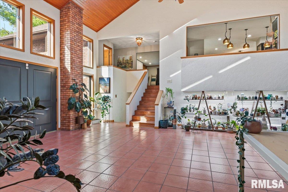 Set in a neighborhood where homes are rarely offered, especially at this price point. With almost two acres near the lake, this custom-built home offers a way of living that feels open, connected, and quietly set apart. At its center, a dramatic atrium great room rises nearly 20 feet with overhead skylights, exposed brick, and warm wood beam ceilings. An interior balcony and upper-level kitchen overlook the space, creating a layout that feels expansive yet connected in a way few homes achieve. Positioned just off the atrium, a private primary wing offers a true sense of retreat. The suite is thoughtfully set apart, and the renovated bathroom is designed for unwinding, featuring a skylit glass shower, soaking tub, and elevated finishes throughout. The kitchen is both expansive and functional, anchored by a massive wraparound island that overlooks the atrium below. Designed for everyday living and entertaining alike, it offers abundant cabinetry, multiple pantry spaces, and an eat-in balcony that brings in natural light. From here, the space flows seamlessly into a dedicated dining area and into a generous living room complete with an automated projector screen... each with its own outdoor balcony, creating multiple places to gather, dine, and connect. Just beyond, a large second bedroom or home office with built-ins, along with a nearby half bath, completes the upper level. The lower level features a den with wet bar that opens directly to the courtyard, along with two bed