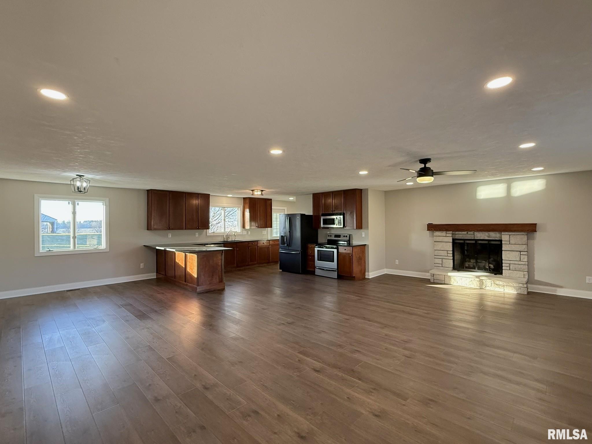 Set on an impressive 3.16 acre parcel boasting multiple outbuildings including three grain bins, a machine shed, a barn, and an attached 2-car oversized garage, this property features a beautifully updated 3 bed, 3 full bath ranch. Whether you’re envisioning a hobby farm, storage for equipment and toys, or simply room to spread out, this property delivers countless possibilities. Inside, the home welcomes you with a freshly painted interior with new flooring & lighting throughout the main level. A modern open concept living/dining/kitchen combo is designed for effortless entertaining or everyday living. The spacious living room features a stunning brick gas fireplace and grand picture window that fills the space with tons of natural light. The functional kitchen space impresses with granite countertops, breakfast bar, pantry, plenty of cabinetry, and a seamless connection to the informal dining area perfect for hosting or gathering. Three redesigned & updated bedrooms including a primary suite with private bath showcasing an oversized walk-in shower ensure plenty of room for everyone while two additional remodeled full bathrooms and main floor laundry provide extra convenience. Downstairs, the basement expands your living options even more with a family room featuring a second fireplace, a large recreation room with pool table, and a huge versatile storage room. This country property is ready for you to move in! Call today!