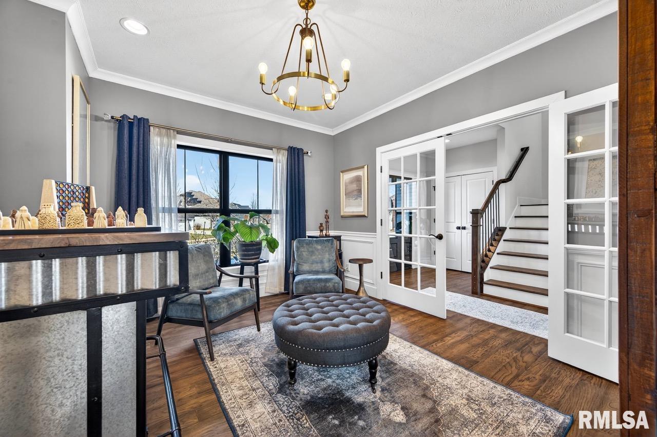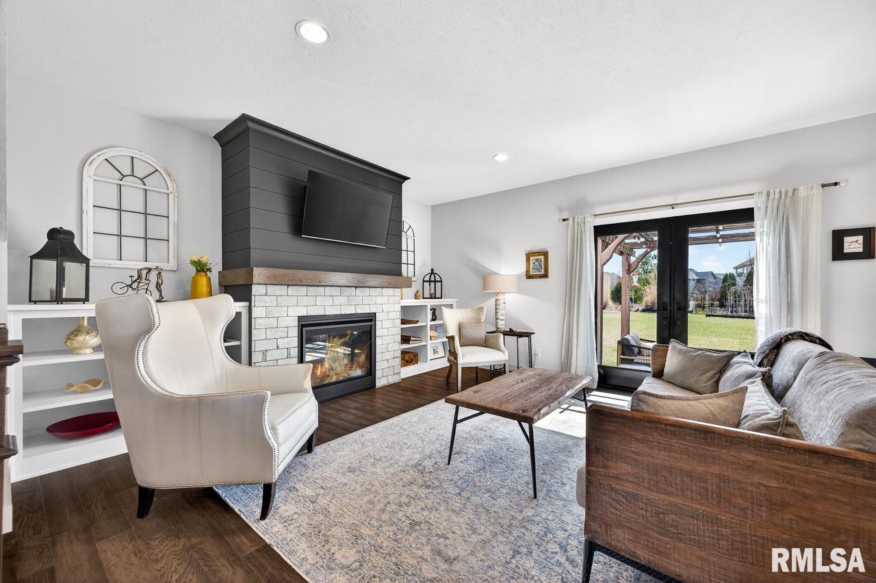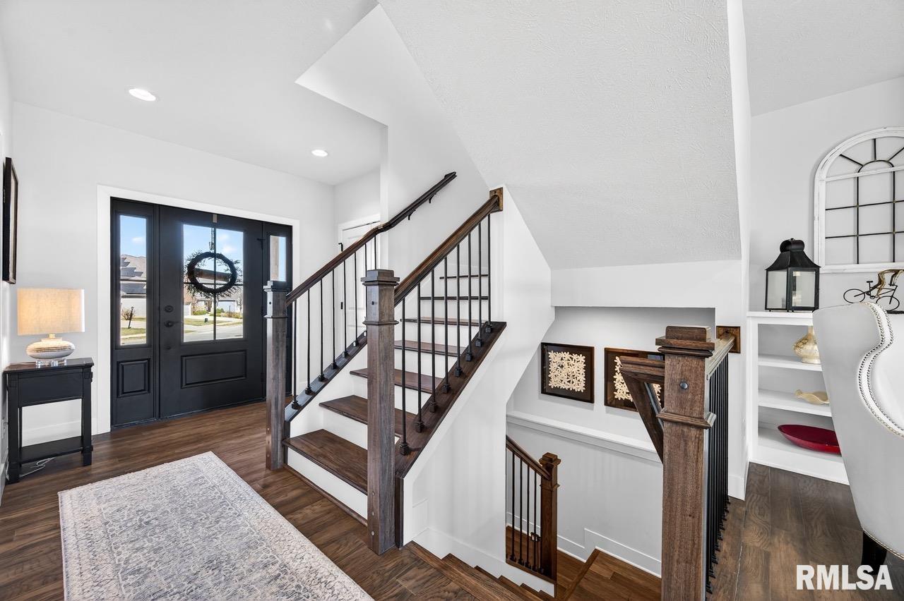 Welcome to this exceptional custom home on a premium .61-acre lot in Dunlap’s sought-after Stone Gate Subdivision. Designed for both comfort and style, the open-concept main level features a light-filled great room with a stunning shiplap and tile gas fireplace, custom built-ins, and French doors leading to the backyard. The informal dining area flows into a beautifully appointed kitchen with an oversized quartz island, white shaker cabinetry, stainless steel appliances, tile backsplash, and a spacious walk-in pantry. A versatile main-floor flex room with French doors is perfect for an office, dining room, or retreat. The three-stall garage includes slat wall panels and a built-in pet wash station. Upstairs offers four bedrooms, a full bath with double vanity, and convenient laundry. The primary suite features vaulted ceilings, pond views, a large walk-in closet, and a luxurious bath with double vanity, custom tile shower, and built-in vanity. A secondary bedroom with French doors and sink adds flexibility. The finished basement includes 9’ ceilings, a rec room with wet bar, full bath, and fifth bedroom. Enjoy outdoor living with a stamped patio, pergola, gas fireplace, fenced yard, fire pit, garden beds, shed, and Monarch Waystation. Walking distance to the nearby park-complete with walking trails, 3 ponds and a playground, as well as the Rock Island Trail and the award winning Hickory Grove Elementary!