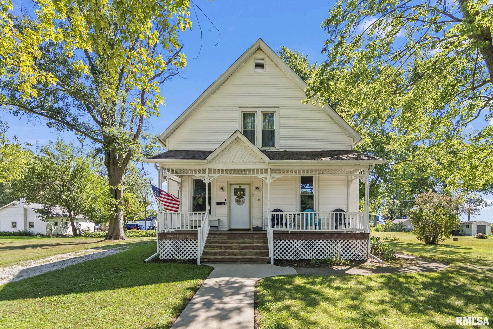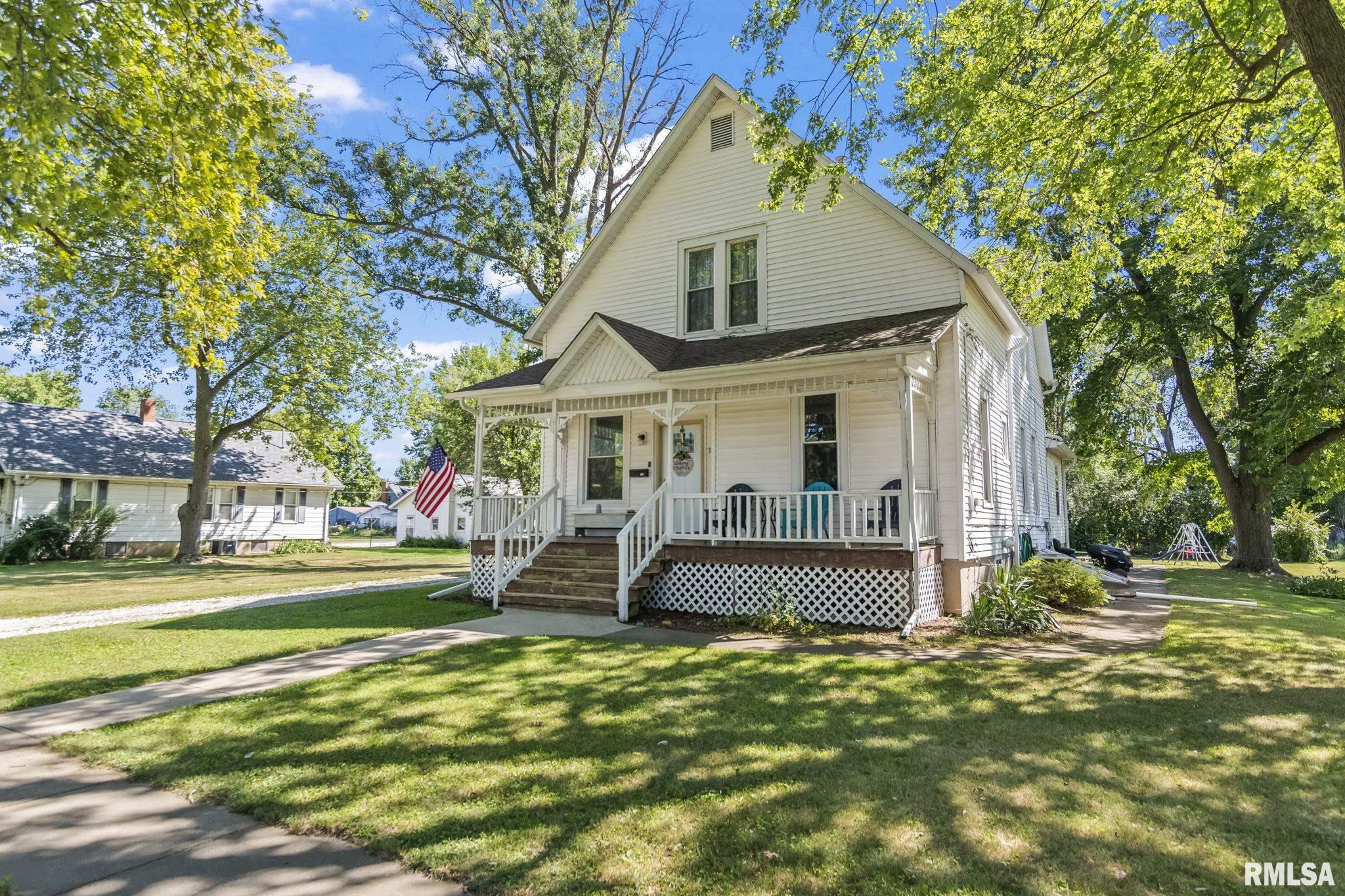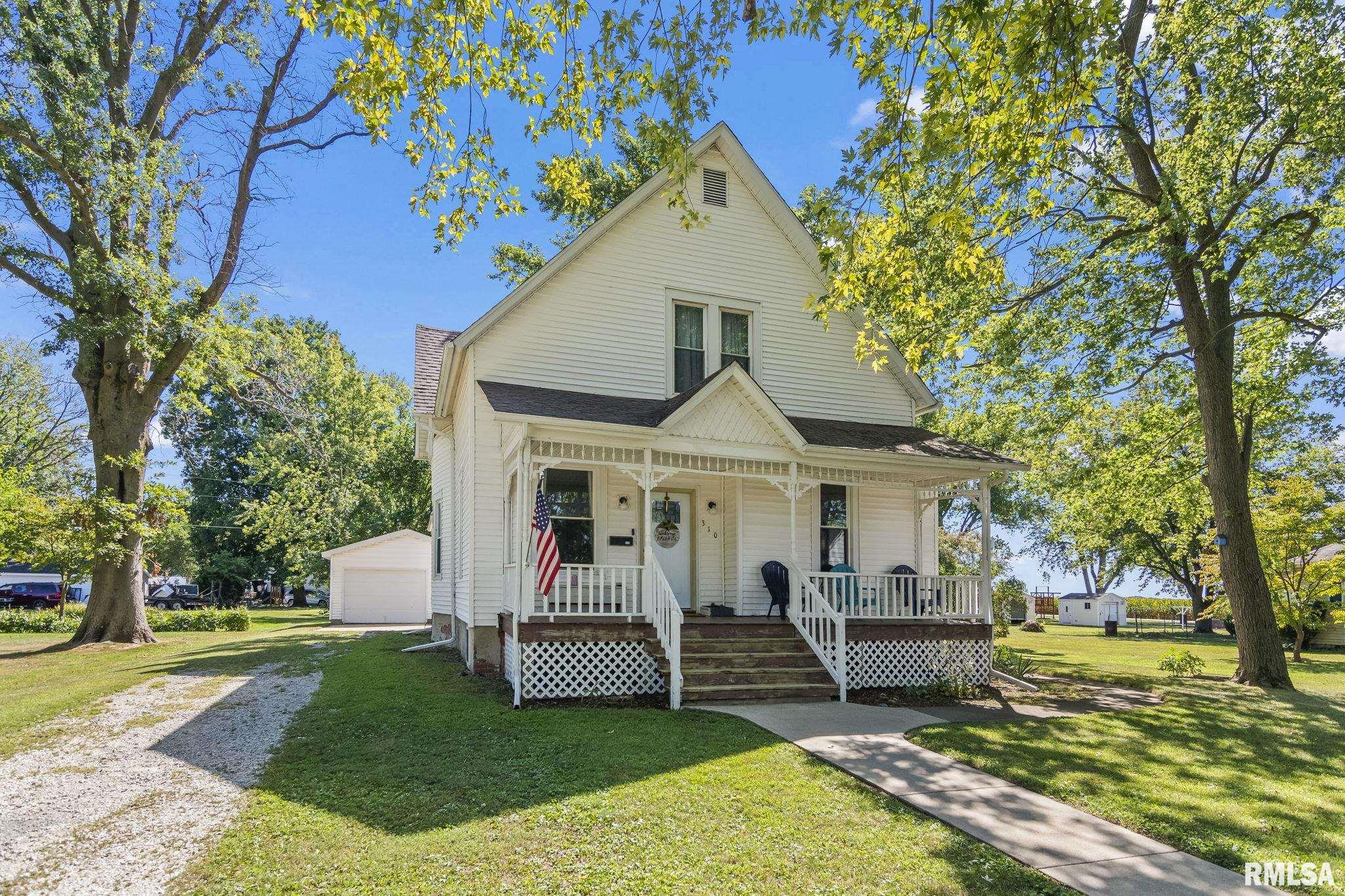 Welcome to this charming 2-story home situated on a generous .4-acre lot, offering both space and character in a convenient layout. New carpet put in early 2025, providing a fresh start for the next owner. Most windows have been replaced (all but two), and the roof was replaced around 2016. Step onto the covered front porch—ideal for relaxing mornings or evening gatherings. The property includes a detached 1-car garage and an unfinished basement, accessible from inside the home or via exterior cellar doors, offering excellent storage or future finishing potential. Inside, you'll find a large kitchen with ample cabinetry & counterspace, perfect for meal prep or holiday baking. Adjacent to the kitchen is a formal dining room with a built-in hutch, adding charm and additional storage. A full bathroom is conveniently located off the kitchen, with an extra shower in the laundry area for added utility. The rear room addition provides flexible living space, suitable as a second family room or a main-floor primary bedroom. Upstairs, you'll find generously sized bedrooms, including a primary bedroom that features two spacious walk-in closets. An upstairs toilet adds nighttime convenience. This home has been pre-inspected, repairs made and is ready for your personal touch!
