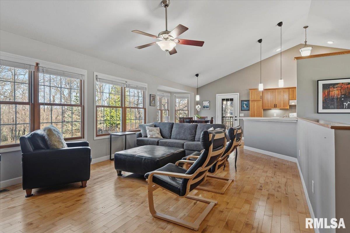 This immaculate 4 BR ranch home is nestled on an enormous corner lot, wrapped in the privacy of thick timber & serene surroundings in every direction & just over an acre in size. Exquisite curb appeal begins with a few mature trees, brick front charm & an inviting covered porch. Inside, soaring vaulted ceilings & warm hardwood floors carry through bright, open common areas. Natural wood shines in the cabinetry, trim & accents, pairing beautifully with crisp neutral color schemes & modern fixtures throughout the practical, attractive kitchen. A wall of windows across the back fills the home with natural light. Step out from the kitchen to a covered deck that effortlessly extends living & entertaining outdoors to enjoy gorgeous views during any season. Spacious BR's are thoughtfully arranged, including a primary suite w/large walk-in closet & ensuite full bath. Venture downstairs to find a bright family or rec space with freshly installed plush, neutral carpet, plus a 4th BR, generous 1/2 bath & laundry room! Discover plumbing is already in place for a future kitchenette, plus tons of other perks like central vac & radon mitigation system. You'll find a backup generator connection installed in 2c attached garage, an appropriately sized & maintained septic system, + a heat pump & central A/C new in 2021 add even more peace of mind! A rare location combination blends rural beauty, quiet subdivision living & a close proximity to city amenities w/ high-value improvements & more!
