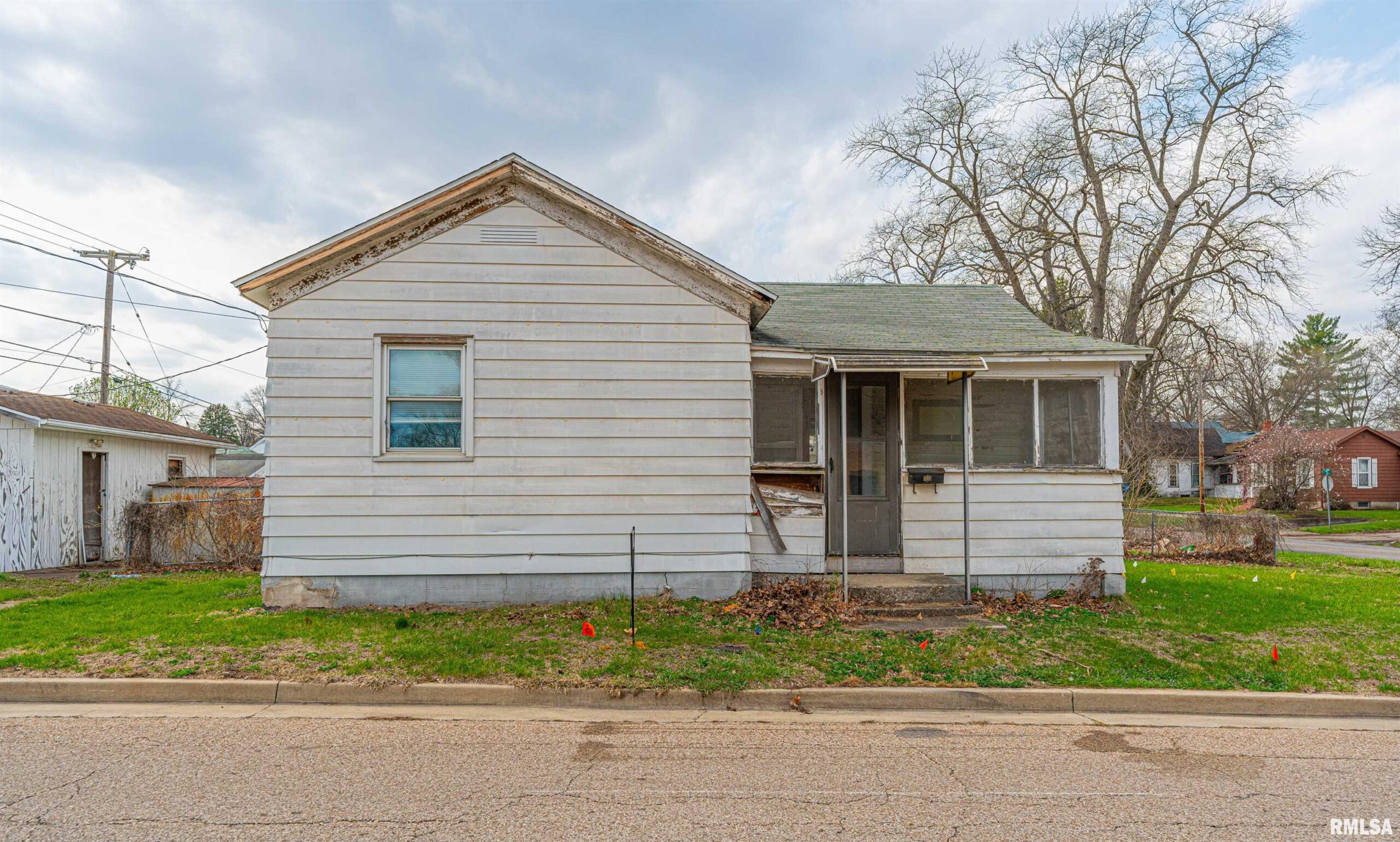 Situated on a corner lot within walking distance of various amenities, this tidy two-bedroom aluminum sided bungalow is packed with opportunity for improvement! Interior boasts an enclosed front porch, front facing living room, eat-in kitchen, two bedrooms, and a full hall bath (currently gutted). Property also features a partial basement, detached garage, older storage shed, and a whole lot of potential both inside as well as outside! ** Sold entirely as is -- cash or conventional financing only, please. **