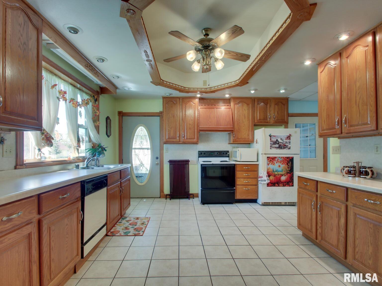 Step into timeless charm with this beautifully updated 2-story home on a corner lot in Carthage. Thoughtfully remodeled, this 4-bedroom, 3-bath residence offers 2,250 sq ft of living space with character and modern convenience. Inside, you’ll find new luxury vinyl plank flooring, tile in the kitchen and baths, and fresh carpet on the stairs and hallway. Tray ceilings with decorative wood inlays and oak French doors add elegance and style. The large kitchen features new oak cabinets and flows into an informal dining room with a bay window. Upstairs, the primary suite includes a private bath, while three additional bedrooms share a second full bath. A third full bath with laundry and a jetted tub is on the main floor. A spacious wraparound porch includes a large enclosed 3-season room. Additional highlights include a leaded glass entry door, ceiling fans in every room, and new paint throughout. The home also boasts a full unfinished basement, large attic with bonus room potential, and radiant boiler heat with thermostats in every room. A heated oversized 2-car attached garage and second rear-facing overhead door, plus a detached 1-car garage, provide excellent parking and storage. Outdoors, enjoy a wraparound porch, concrete patio, and large 0.29-acre corner lot. With a metal roof, vinyl siding, gutters, and many updates already complete, this home blends historic charm with modern comfort.