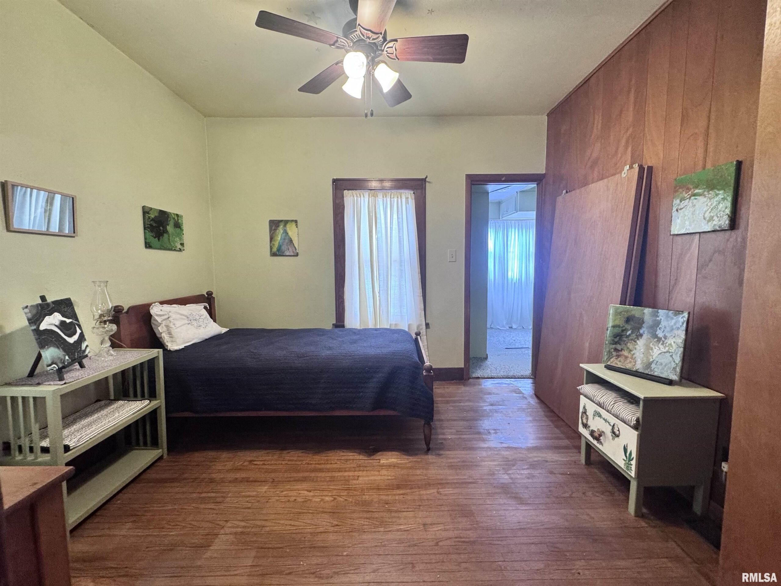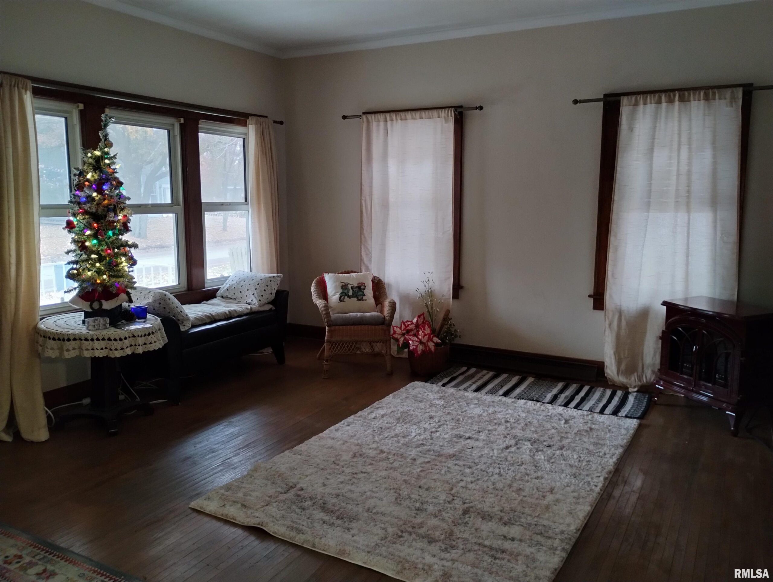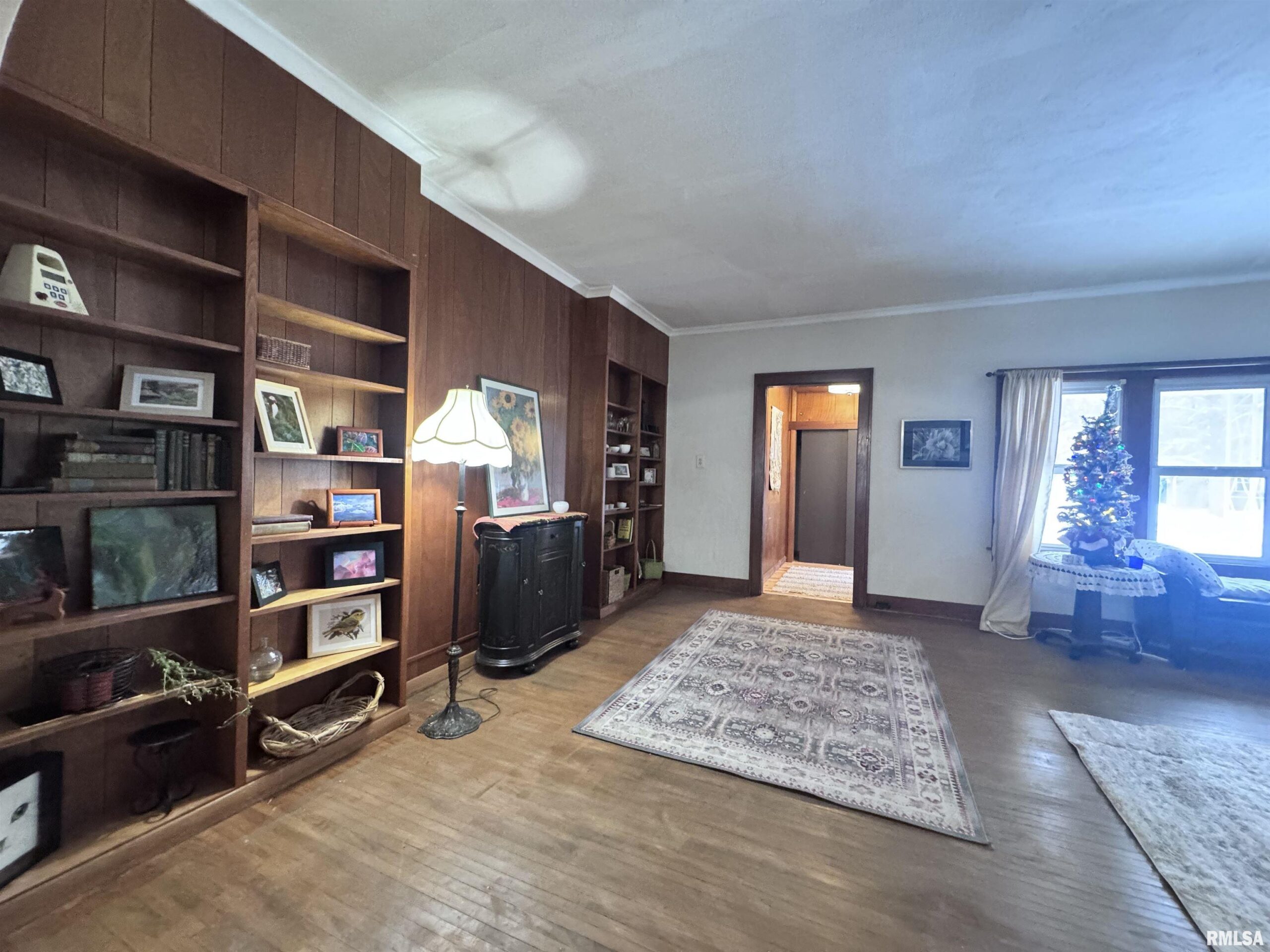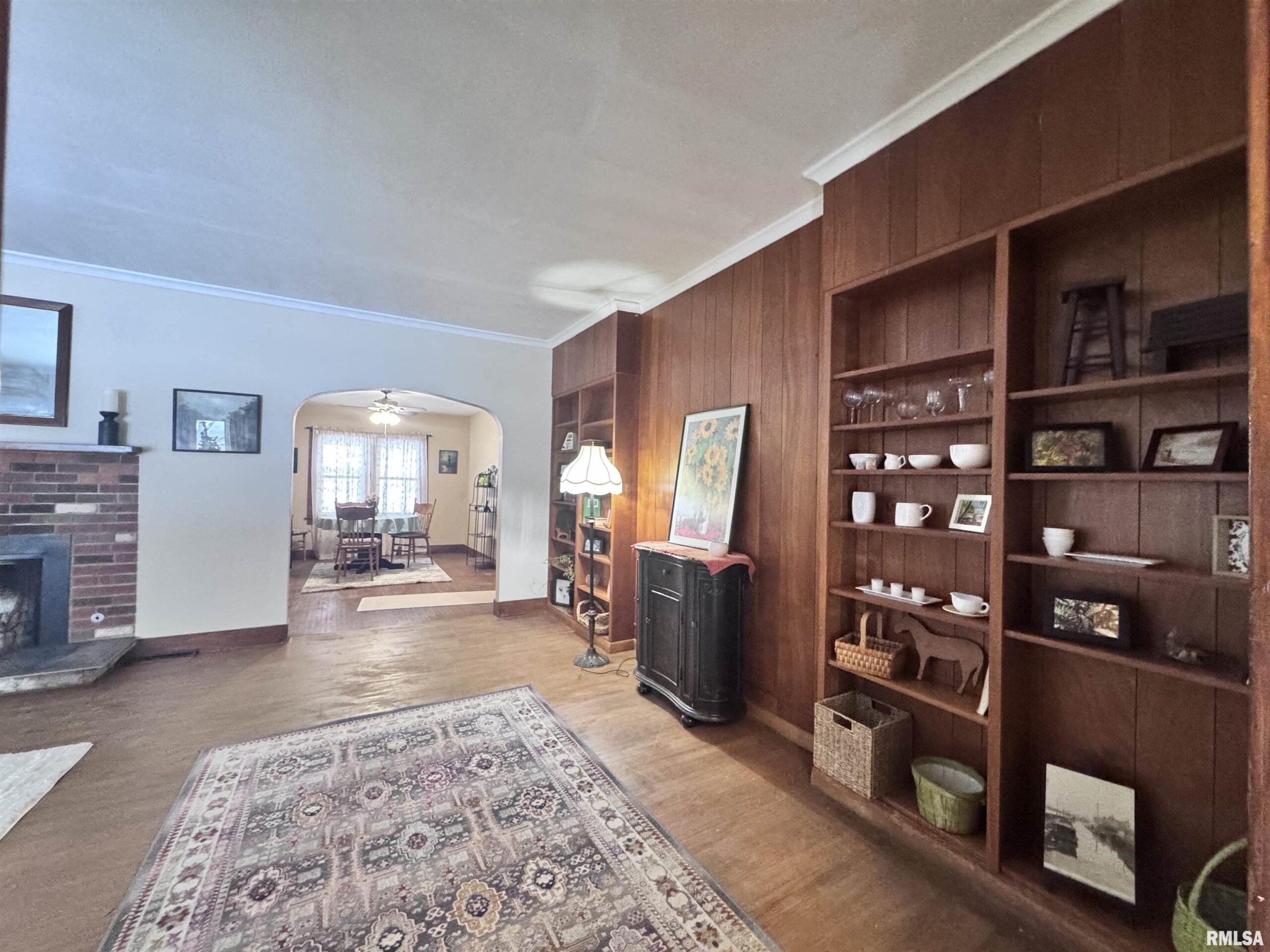 Take a “deep dive” into the Mid-Century Modern style of this updated ranch located along a tree-lined street just west of downtown Macomb. The exterior has been freshly painted, landscaped, and a new sewer line has been installed. The covered front porch is very inviting, and entering the home, you will find a foyer with a large front closet. The living room features hardwood floors, a fireplace with an electric insert, a stunning wall of built-in shelving, and numerous windows. Just off the living room is a large dining room, also featuring hardwood floors. The kitchen has been updated with new appliances, countertops, and flooring. It features a walkout to the enclosed sun porch and a large screened-in patio that overlooks the partially fenced backyard. The primary bedroom features wood floors and a spacious walk-in closet and is accompanied by a full bath located just next to it. This level of the home also features a den or second bedroom. The basement level of the home features a laundry area, a ¾ bathroom, and ample storage space. The dramatic improvements made to this house in recent months include a partial new shingled roof, a new sewer line, a new furnace, AC, a water heater, kitchen appliances, and a washer and dryer.