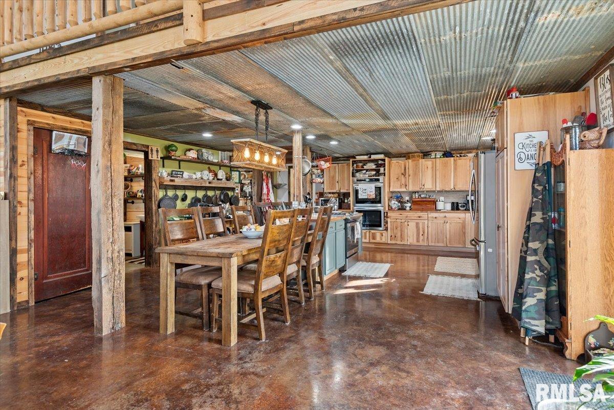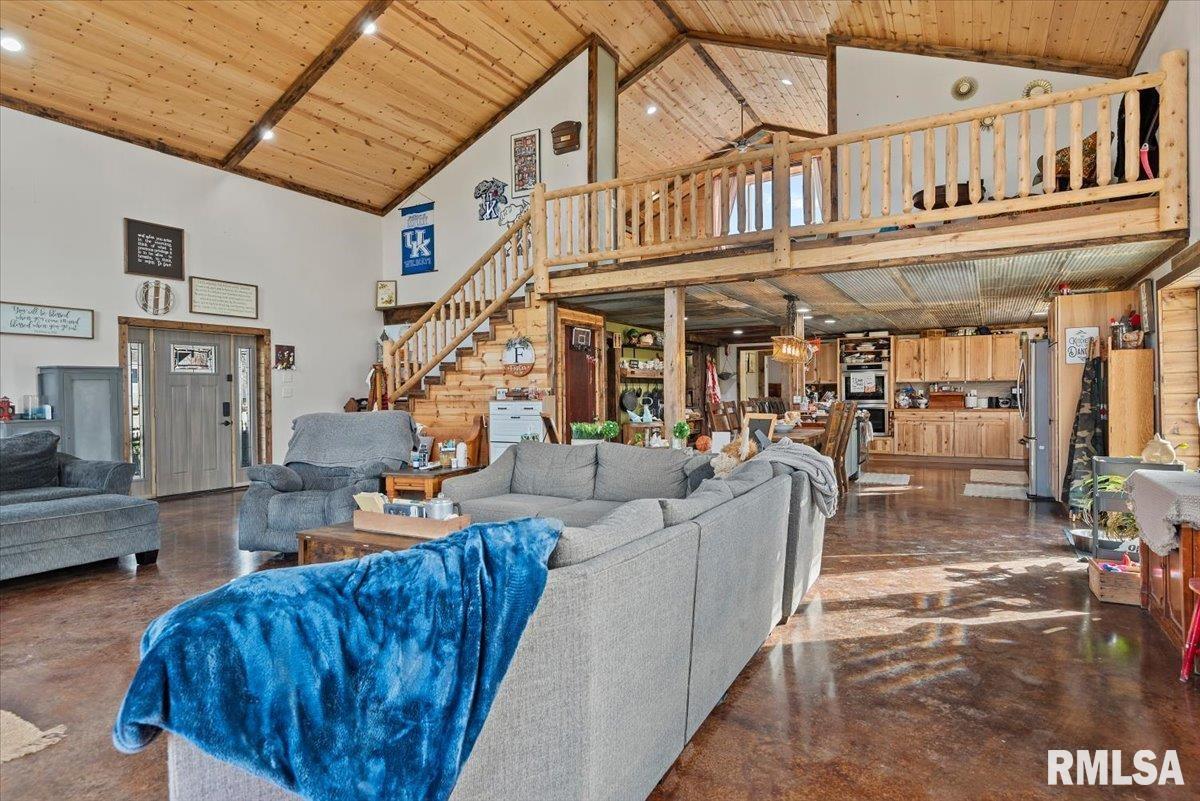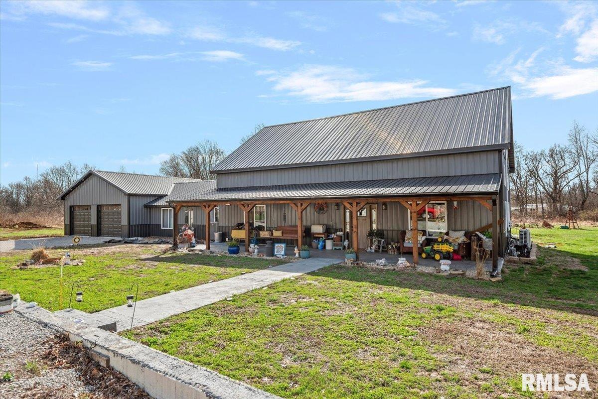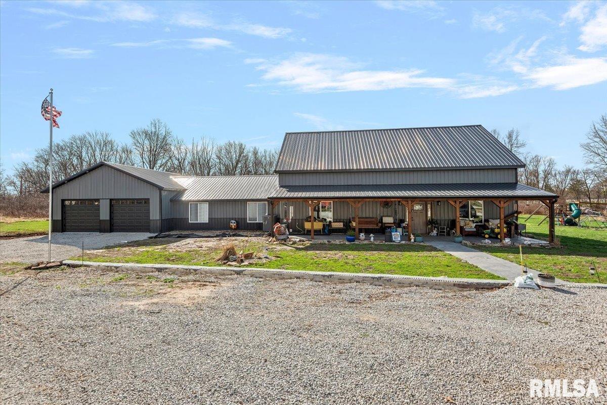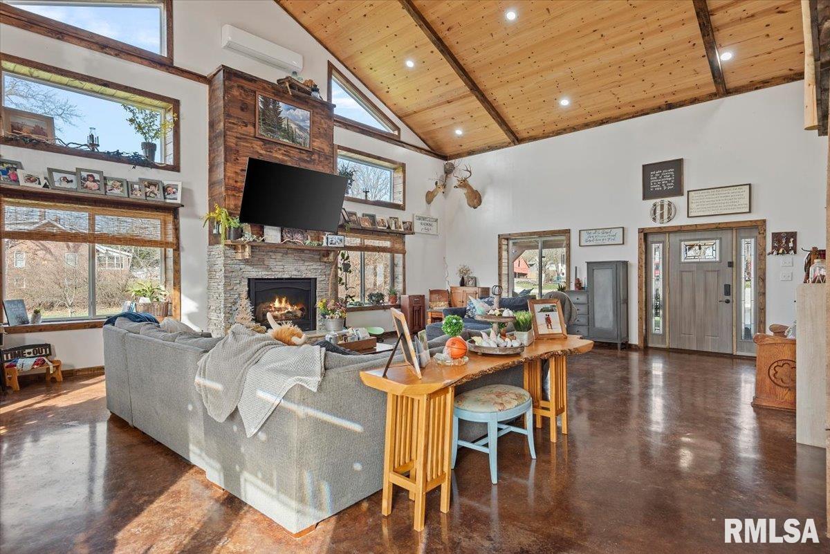 Built in 2022, this one-of-a-kind home blends modern efficiency with rustic charm and sits on 4.91 acres on the edge of town, offering privacy, space, and beautiful wooded views. The exterior features durable steel siding and a steel roof, along with a large covered front porch that welcomes you into the home. Inside, the spacious living room is the heart of the home, showcasing vaulted wood ceilings and a stunning center fireplace that creates a warm, inviting atmosphere. The primary suite overlooks the living room from the upper level, providing a unique open feel while still offering a private retreat with its own attached bathroom. Just off the living room is the rustic-style kitchen, featuring wood cabinetry, a metal ceiling, and a large center island. A full bathroom and convenient laundry/pantry room are located just off the kitchen. The main level includes two additional bedrooms, plus a second living space currently used as a canning/dining room, offering flexibility for your needs. Comfort is key with concrete flooring throughout the home with in-floor heated tubing, keeping the entire house cozy and warm. Step outside to enjoy the large backyard patio overlooking peaceful wooded views, perfect for relaxing or entertaining. The property also features an attached 900+ sq ft two-car garage and an additional two-car carport providing space for vehicles, equipment, or recreational toys. If you’re looking for modern construction, rustic character, and acreage near town