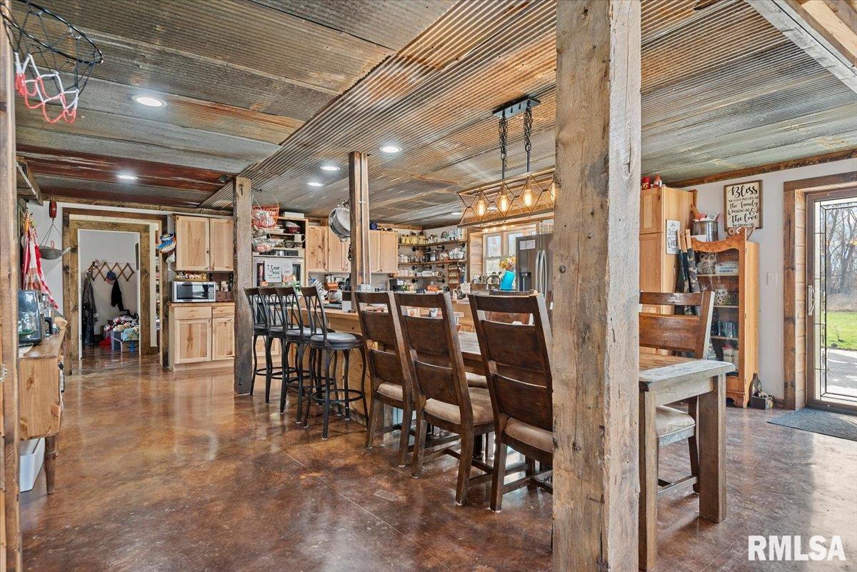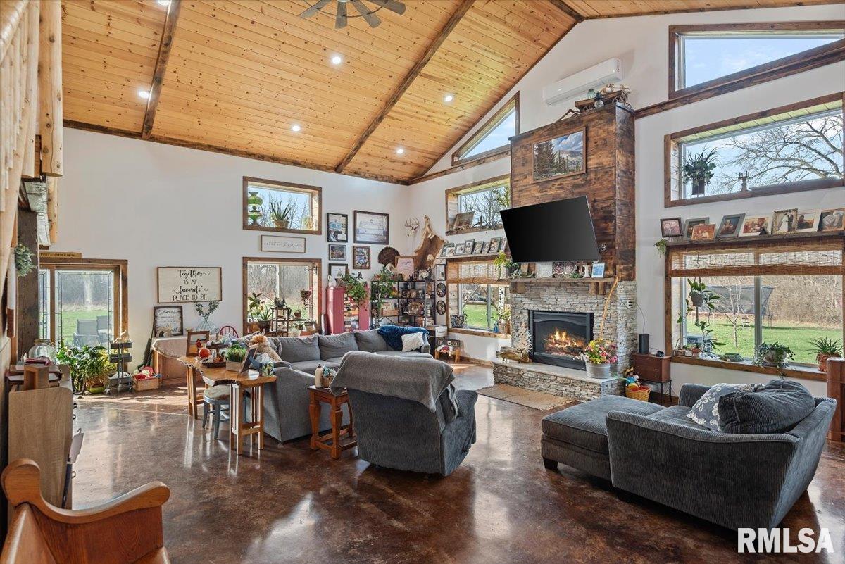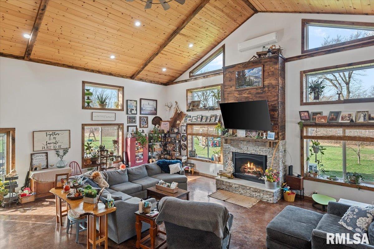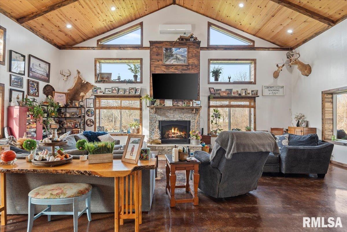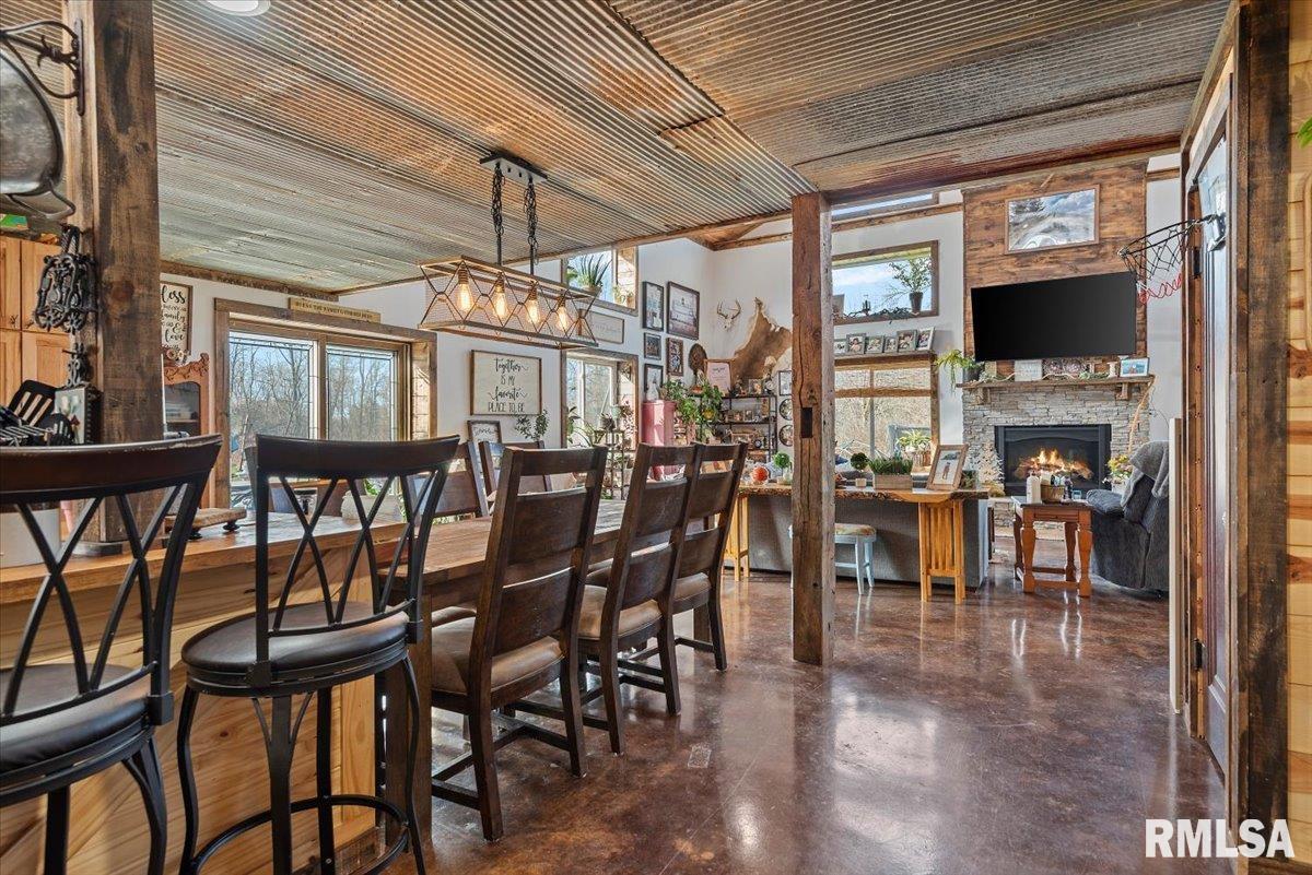 Built in 2022, this one-of-a-kind home blends modern efficiency with rustic charm and sits on 4.91 acres on the edge of town, offering privacy, space, and beautiful wooded views. The exterior features durable steel siding and a steel roof, along with a large covered front porch that welcomes you into the home. Inside, the spacious living room is the heart of the home, showcasing vaulted wood ceilings and a stunning center fireplace that creates a warm, inviting atmosphere. The primary suite overlooks the living room from the upper level, providing a unique open feel while still offering a private retreat with its own attached bathroom. Just off the living room is the rustic-style kitchen, featuring wood cabinetry, a metal ceiling, and a large center island. A full bathroom and convenient laundry/pantry room are located just off the kitchen. The main level includes two additional bedrooms, plus a second living space currently used as a canning/dining room, offering flexibility for your needs. Comfort is key with concrete flooring throughout the home with in-floor heated tubing, keeping the entire house cozy and warm. Step outside to enjoy the large backyard patio overlooking peaceful wooded views, perfect for relaxing or entertaining. The property also features an attached 900+ sq ft two-car garage and an additional two-car carport providing space for vehicles, equipment, or recreational toys. If you’re looking for modern construction, rustic character, and acreage near town