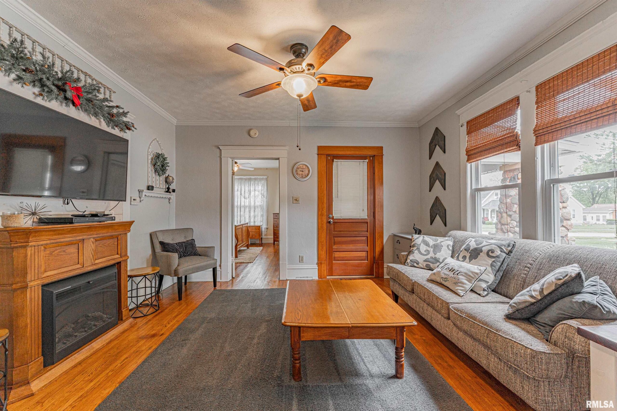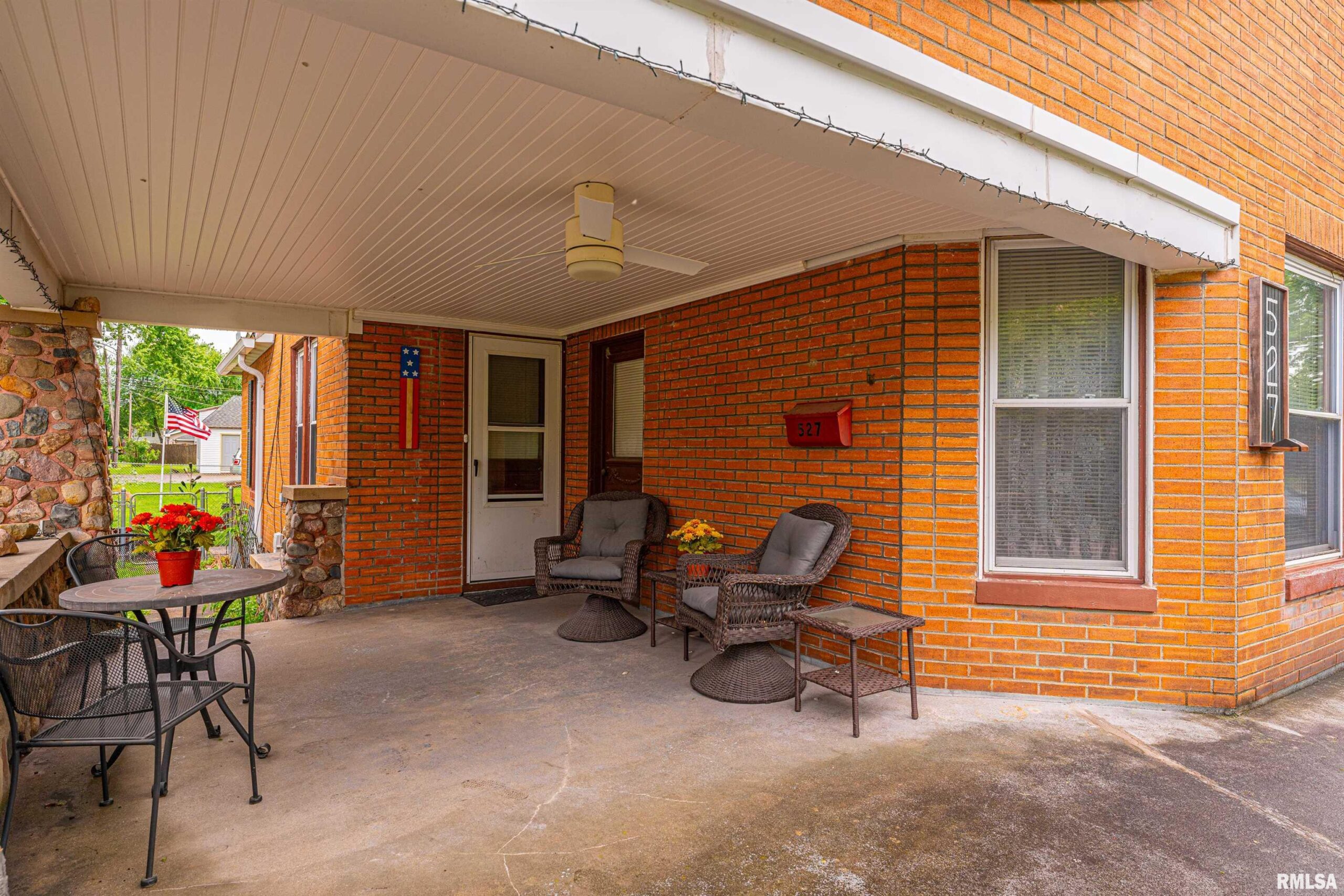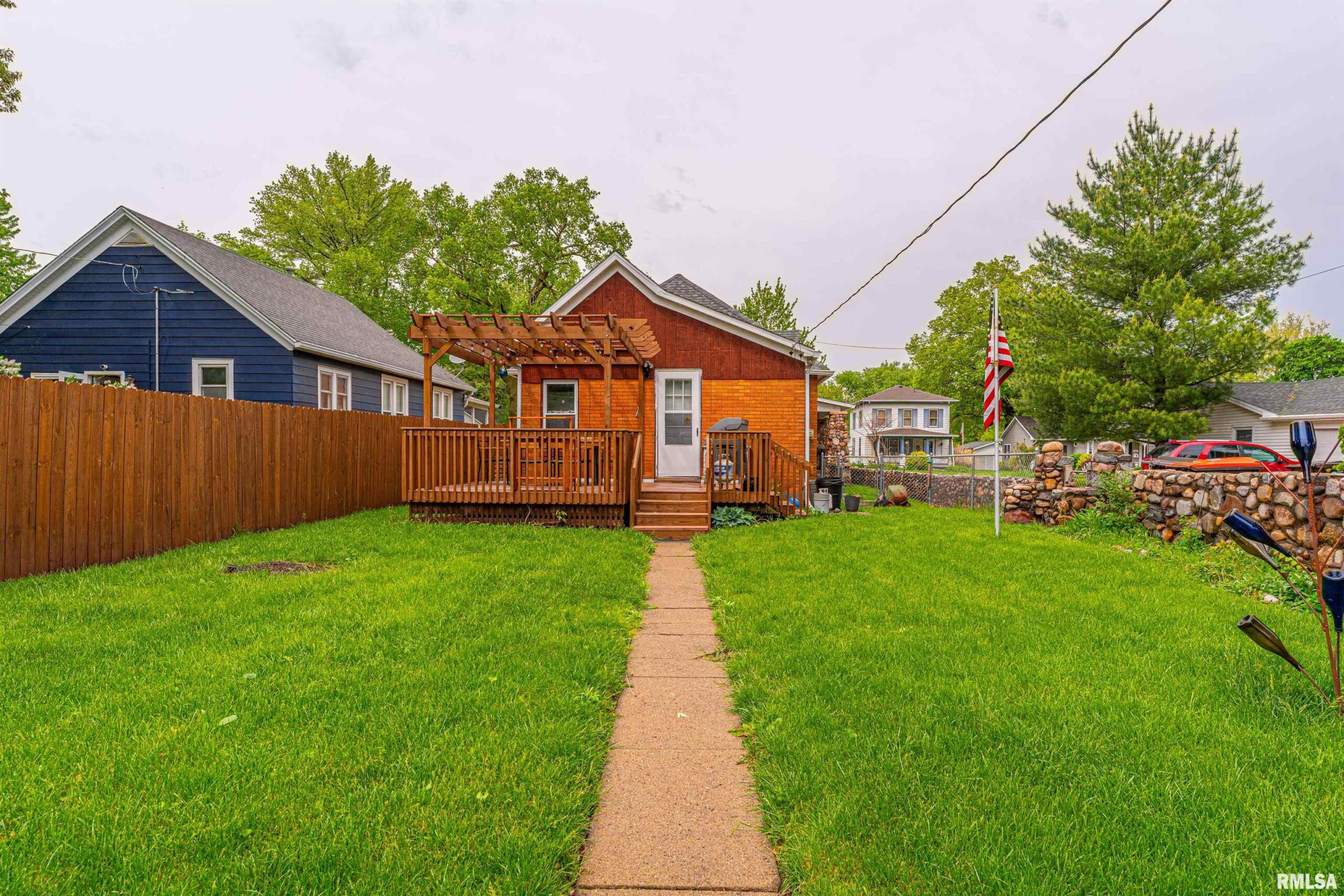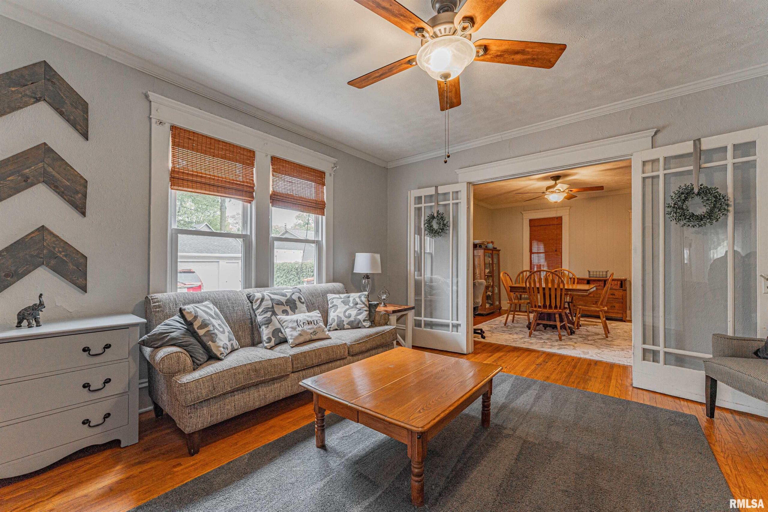 Charming two-bedroom brick bungalow style home with character of years past and updates for today! Inside, you will find a bright and airy front facing living room with hardwood flooring and classic French doors, gracious formal dining room with ample space to accommodate a large table and chairs, equipped kitchen with an adjacent 5X5 walk-in pantry, two bedrooms -- both with hardwood flooring, convenient laundry facilities, and an updated full hall bath. Property also features an excellent front/side covered porch, vinyl replacement windows throughout, all appliances to remain including washer and dryer, rear deck with an overhead pergola, fenced backyard, partial basement, in addition to an older two car detached garage with newly installed vinyl siding (2026), rear alley access, in addition to adjacent off-street gravel parking. Newer architectural roof and water heater are additional noteworthy features. Conveniently located in the center of town with neat cobblestone touches on the front porch and along the side alley, this solid and incredibly charming residential dwelling will NOT last long!