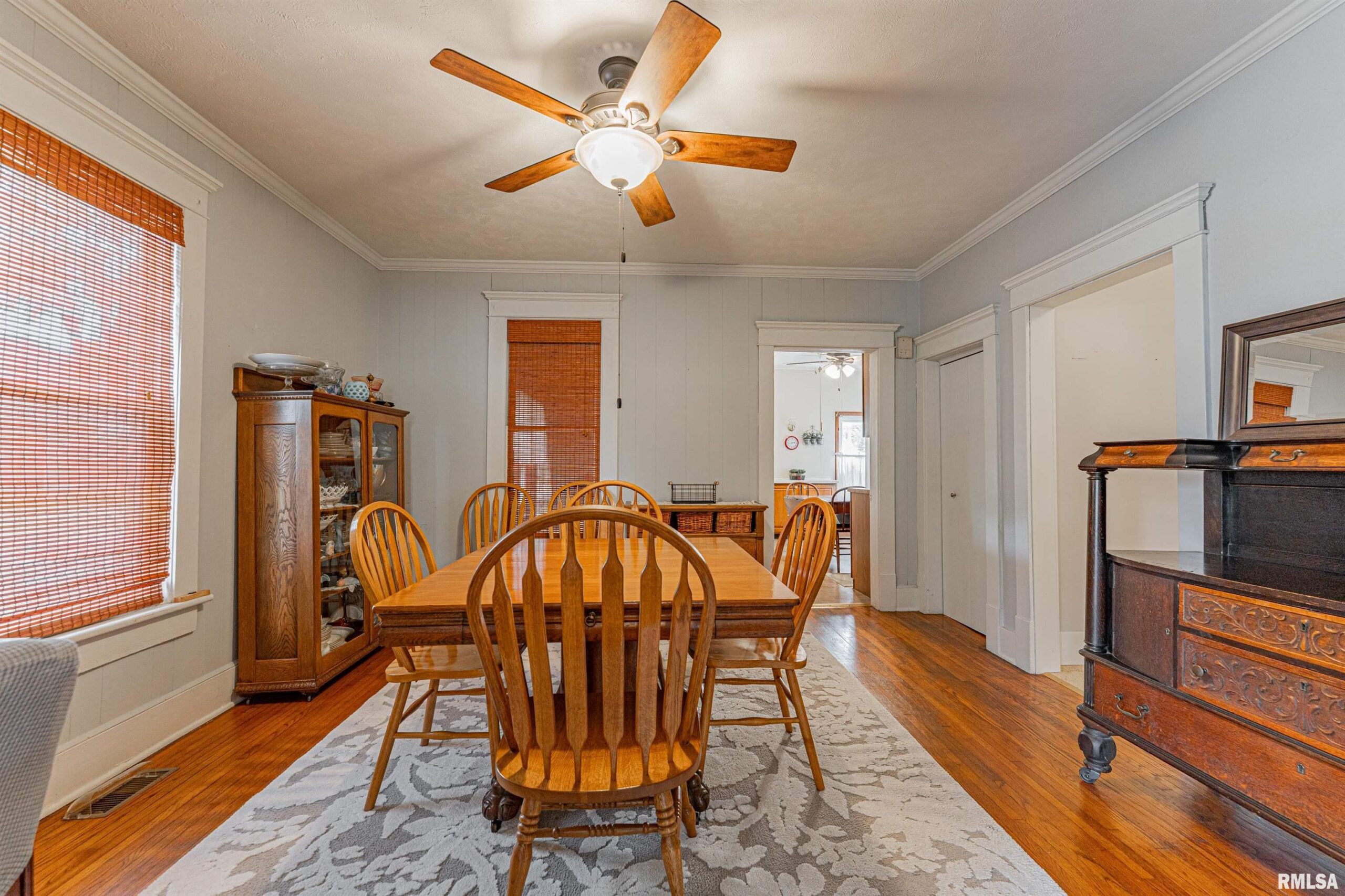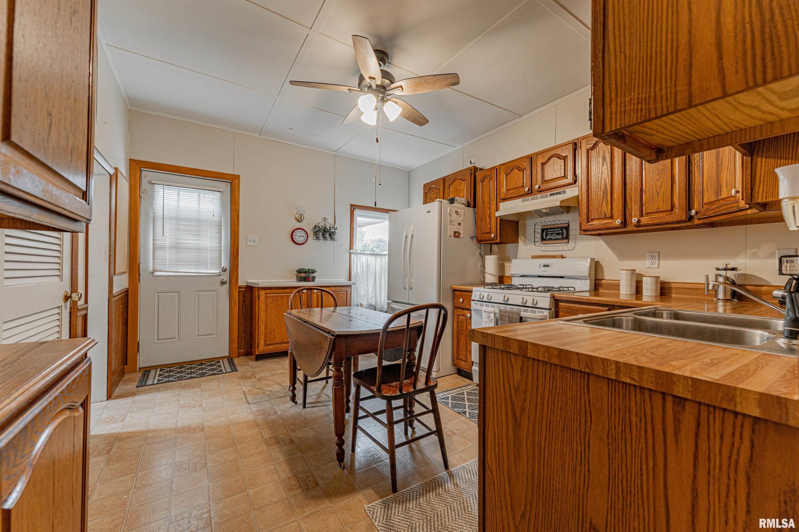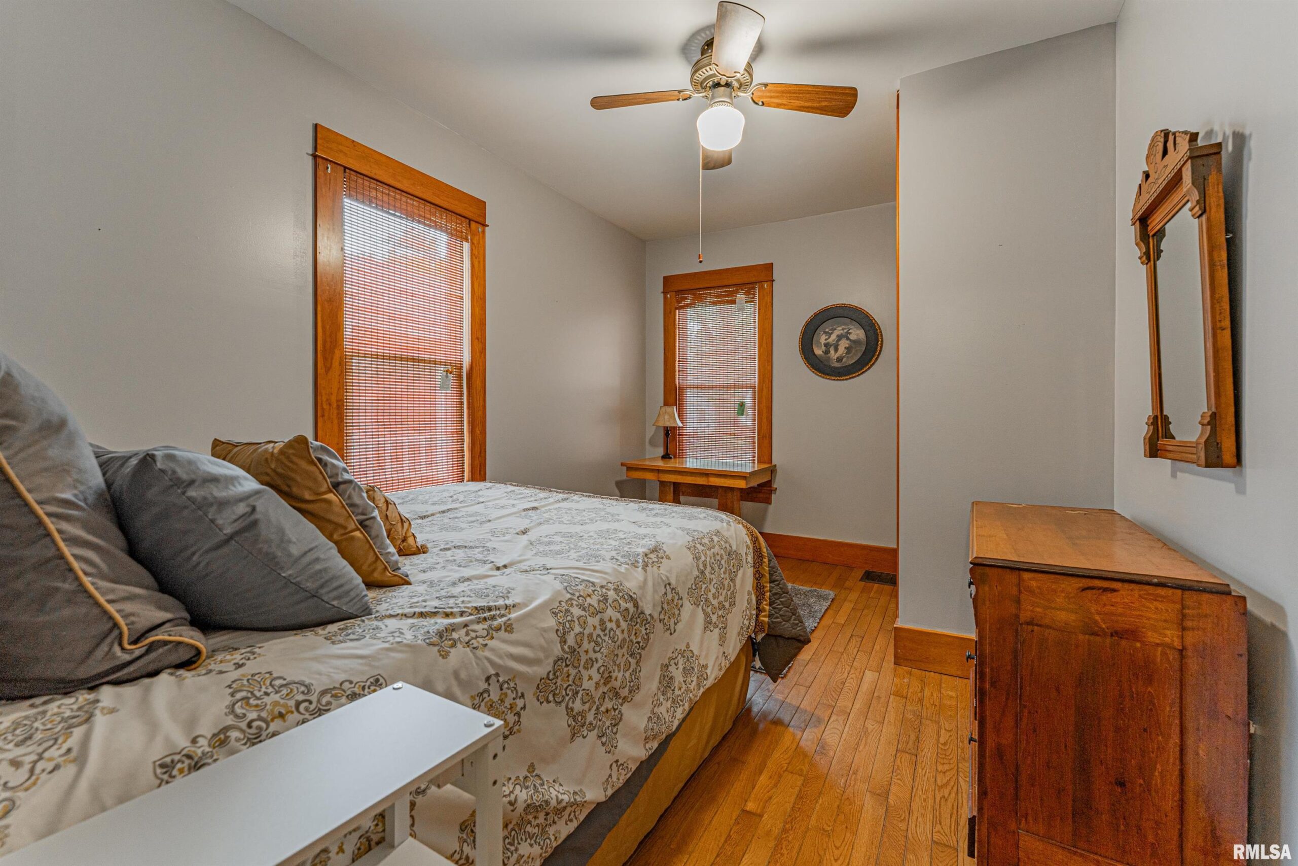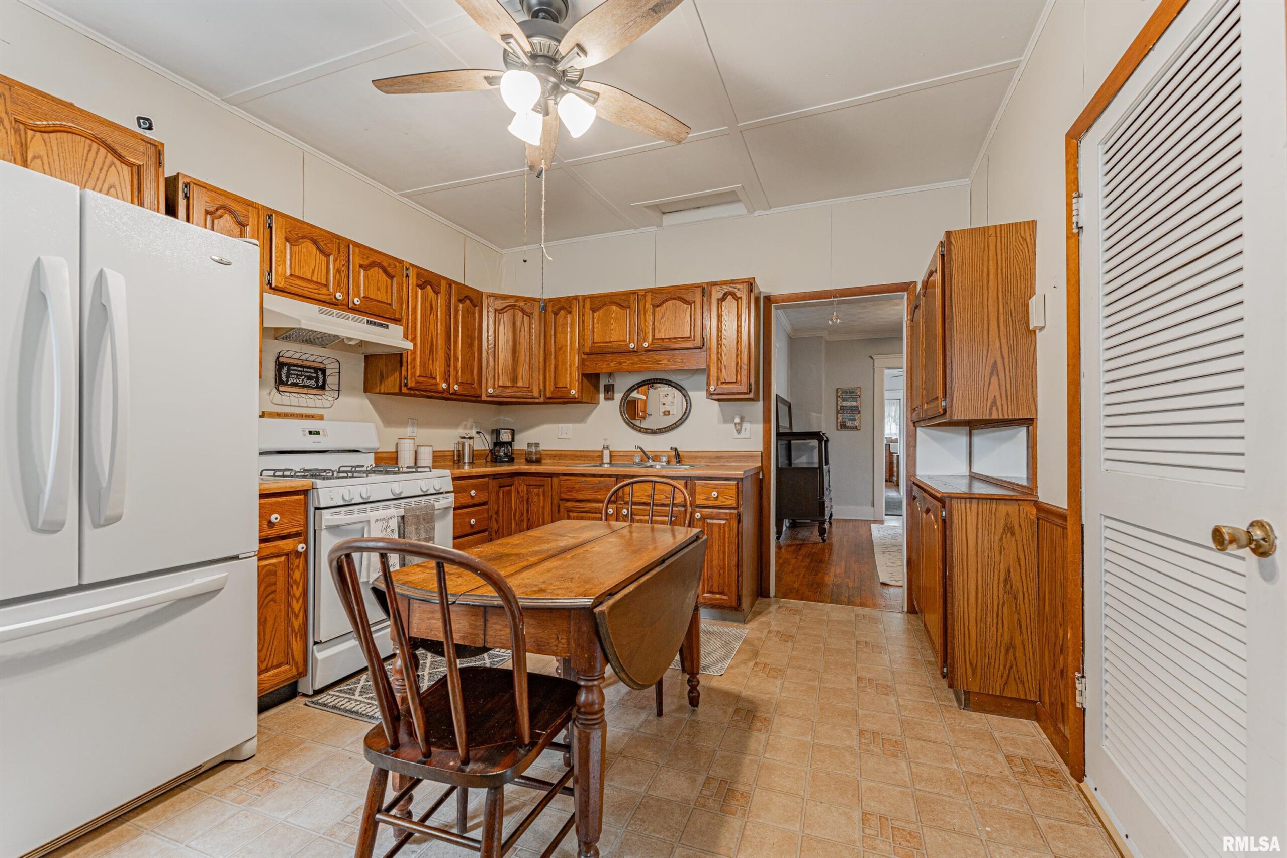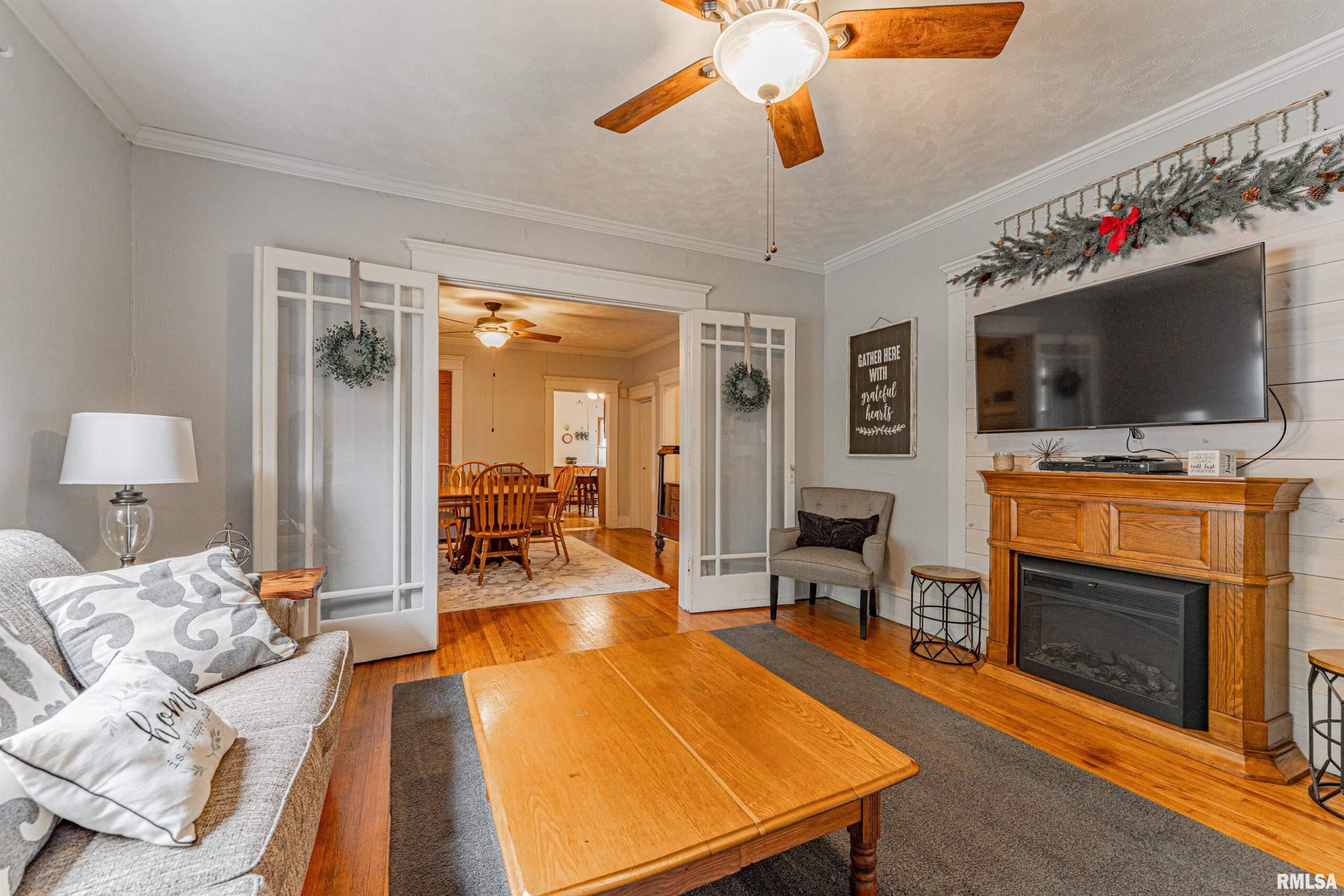 Charming two-bedroom brick bungalow style home with character of years past and updates for today! Inside, you will find a bright and airy front facing living room with hardwood flooring and classic French doors, gracious formal dining room with ample space to accommodate a large table and chairs, equipped kitchen with an adjacent 5X5 walk-in pantry, two bedrooms -- both with hardwood flooring, convenient laundry facilities, and an updated full hall bath. Property also features an excellent front/side covered porch, vinyl replacement windows throughout, all appliances to remain including washer and dryer, rear deck with an overhead pergola, fenced backyard, partial basement, in addition to an older two car detached garage with newly installed vinyl siding (2026), rear alley access, in addition to adjacent off-street gravel parking. Newer architectural roof and water heater are additional noteworthy features. Conveniently located in the center of town with neat cobblestone touches on the front porch and along the side alley, this solid and incredibly charming residential dwelling will NOT last long!