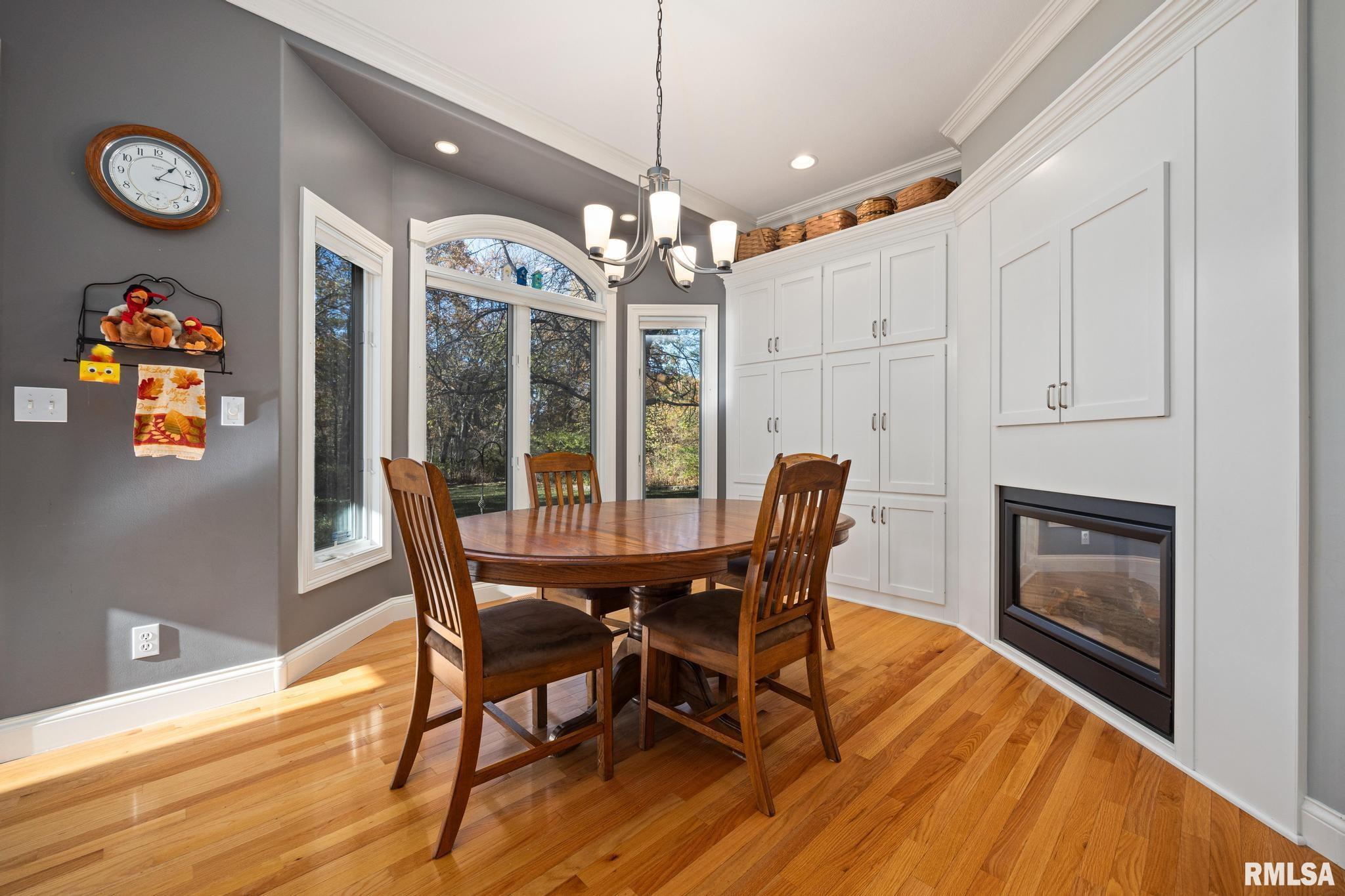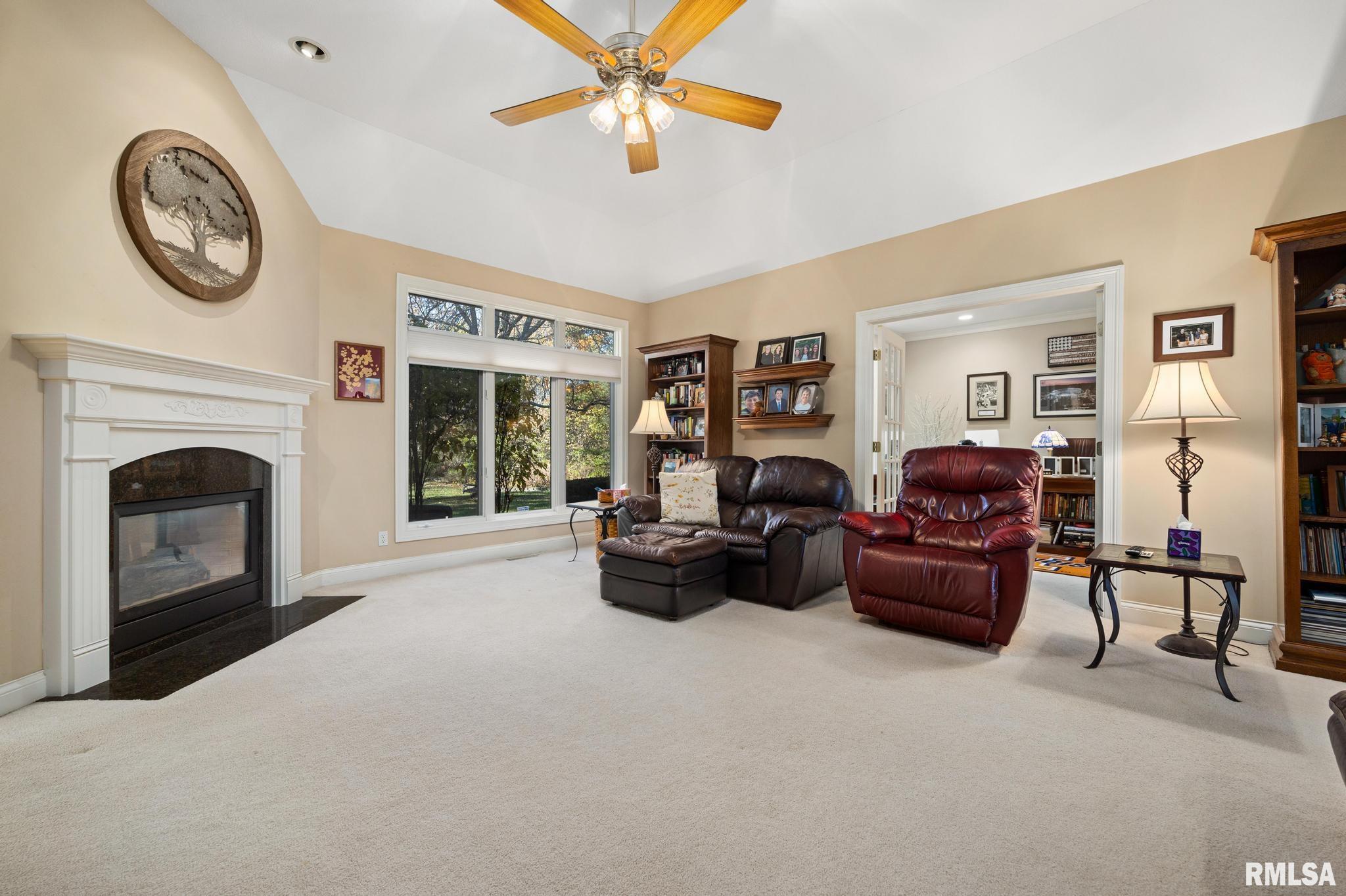 This impeccable ranch home truly has it all! Nestled on a quiet cul-de-sac across from a neighborhood park, it welcomes you with wonderful flow from the front door through the elegant formal dining room featuring a vaulted ceiling and arched window. The spacious great room offers a tray ceiling, a see-through fireplace, and French doors that open to a versatile office or second bedroom. The beautifully updated kitchen boasts white cabinetry, quartz countertops, slate appliances, and a generous dining area with a wall of custom cabinets and a cozy fireplace. Sliding doors lead to a patio overlooking a private, wooded backyard, perfect for relaxing or entertaining. Additional features include a pantry closet and a convenient roll-out pantry cabinet. The primary suite is a true retreat, offering a sitting area with fireplace, office space, and access to a private deck. The luxury bath includes double sinks, a jetted tub framed by elegant columns, and a separate shower and toilet room. A main-floor laundry room with cabinetry and a deep sink adds everyday convenience. The finished basement expands your living space with a family room featuring a built-in bar, custom built-ins, a large rec/flex room with egress window, a full bath, and two storage rooms. This home blends comfort, elegance, and functionality, inside and out.