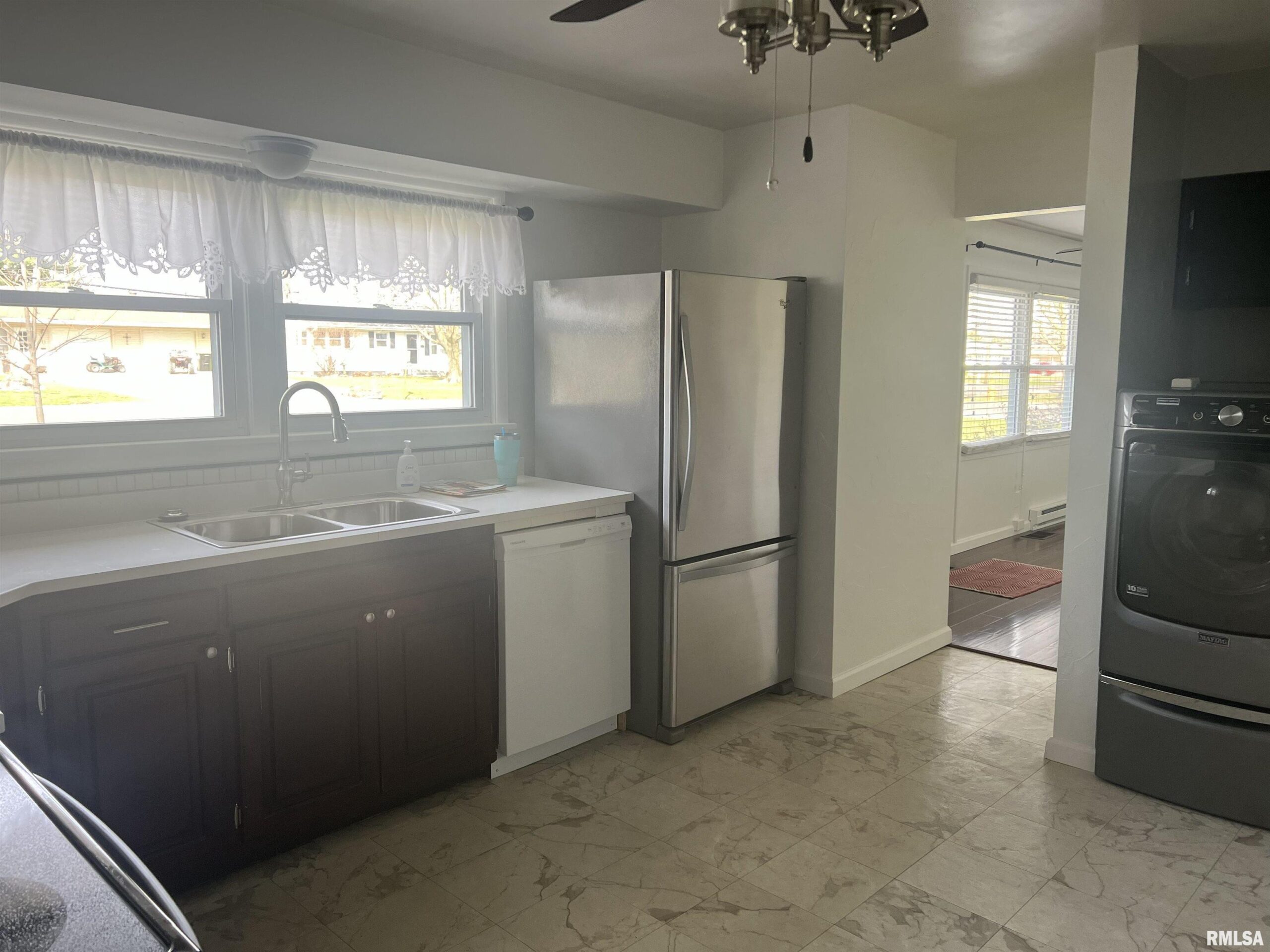 There is nothing like having freshly painted rooms in the whole house! There was new flooring laid in the Master Bedroom too! There are Absolutely no steps to take in this one! Updates start with the eat in Kitchen, the counter tops are solid surface and bright and a new Disposal. All the Appliances stay including the front loader Washer and Dryer. There is a new Bathroom with a walk-in shower. The Siding, Fence and Roof were done in 2019, with the sewer line replaced in 2016. The replacement windows make cleaning so easy, this house could not be more comfortable! The yard is huge with a portion fenced for your pleasure, next to the Shed which is a one car garage. Use it your way!! The garage has lots of storage and workspace room. Come and see it, it won't last long.