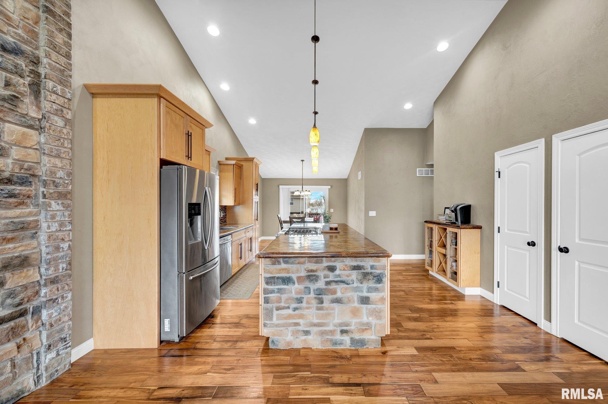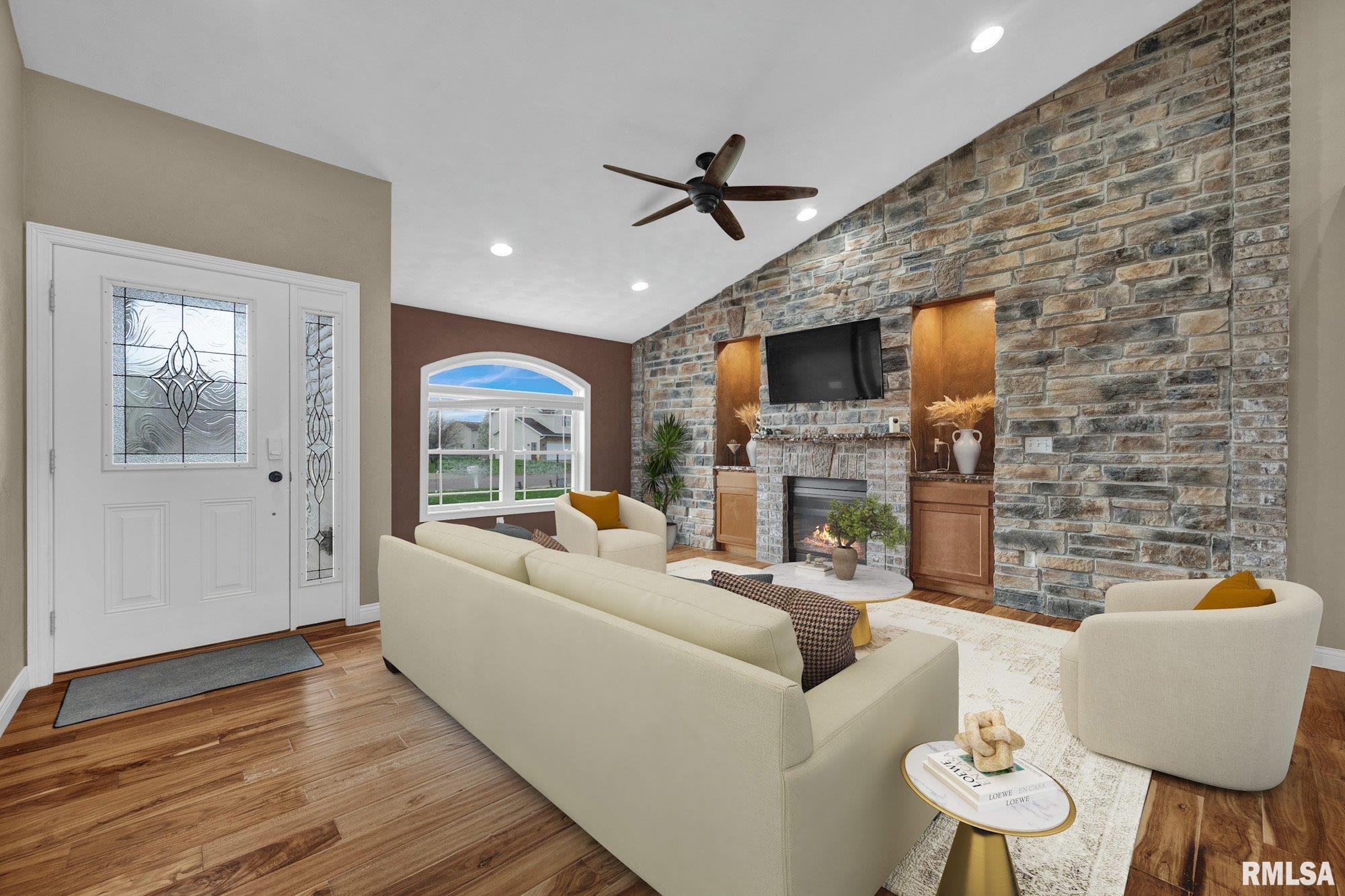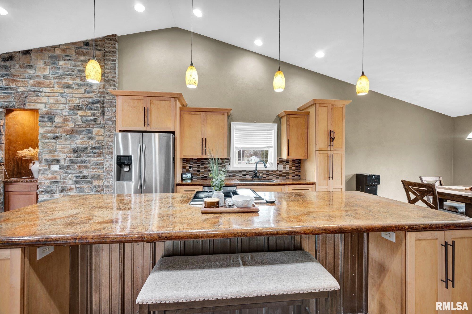 Offers will be reviewed Monday 4/6 at 4:00pm - Seller has the option to accept any offer at any time. NO HOA FEES! Beautifully maintained attached family home built in 2016, offering 3 bedrooms and 3 full bathrooms in a desirable Summit Estates subdivision. The main level features an open-concept layout with stunning concrete countertops, a large island perfect for entertaining, and warm brick accents including a cozy fireplace. The primary suite includes a tiled walk-in shower and a spacious walk-in closet. The finished basement expands your living space with a stylish wet bar, stone electric fireplace, an additional bedroom, full bath with walk-in tiled shower, and a versatile bonus room ideal for an office, gym, or media space. Enjoy outdoor living with a large deck accessible from both the dining room and primary bedroom and fenced yard. Updates include: Fence 2020, Landscaping & Lamp Post 2024. Additional highlights include a 2-stall garage, stamped concrete driveway and sidewalk, and the added bonus of NO HOA fees. Move-in ready with modern finishes throughout!