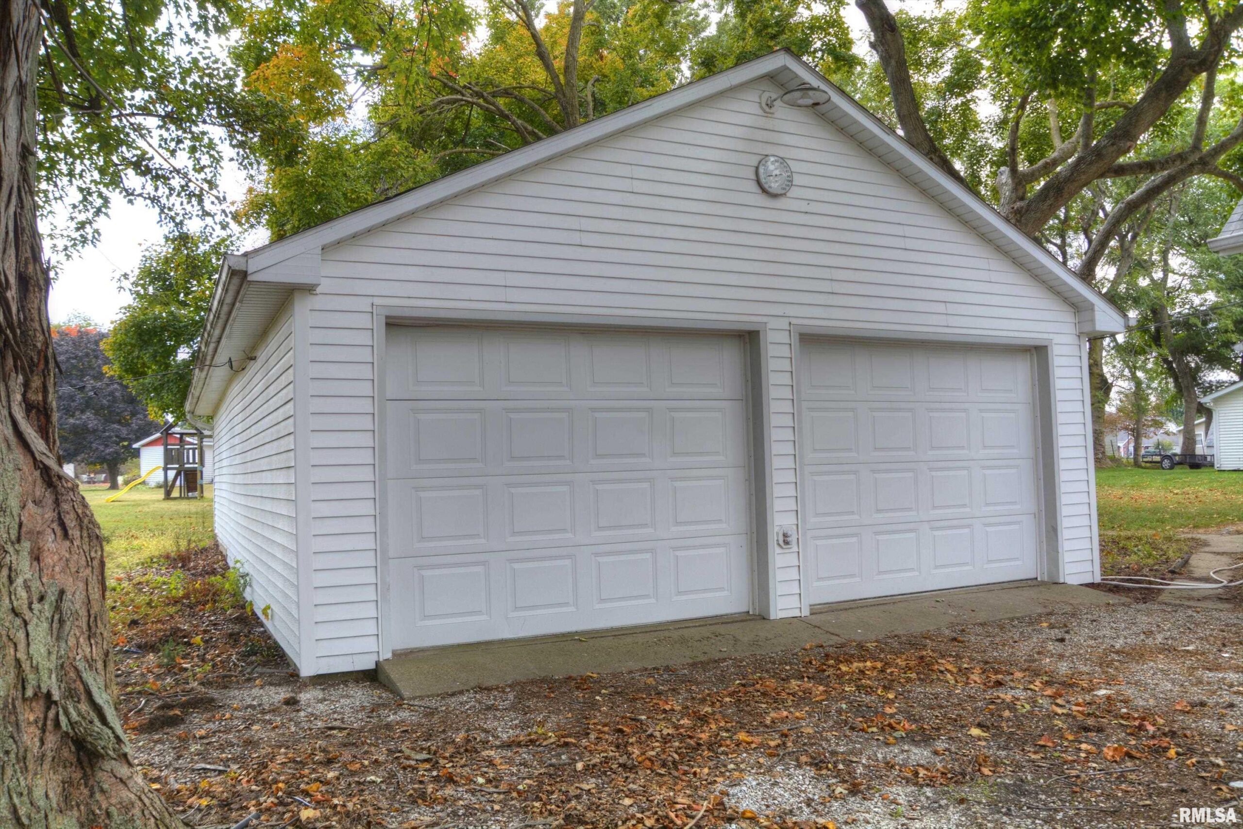 With an oversized 36'x22' garage plus a 32'x16' metal building, this affordable property has lots of space for your vehicles, toys, and hobbies. Freshly painted interior. New vinyl plank flooring and carpet were installed on the main level in 2025. There are two adjoining rooms upstairs -- one could be used as a 3rd bedroom. Mature trees provide plenty of shade.