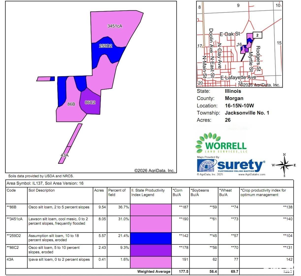 What a unique opportunity and tract of land on the edge of Jacksonville, IL! These 32.03± acres are situated between Illinois Avenue and Strawns Crossing Road at the Northeast corner of town. Approximately 26.0± acres are tillable and carry a Productivity Index Rating of 130.7. Of the tillable acreage, 18.0± acres are Class A soils Osco, Lawson and Ipava. Tenancy is open for 2026 subject to reimbursement of input costs. Multiple access points (from both Illinois and Independence Avenues) and the land’s proximity to industry and residential neighborhoods could lead to several future use scenarios. City water and sewer are nearby. Each of the four tax parcels that comprise this acreage are Enterprise Zones.